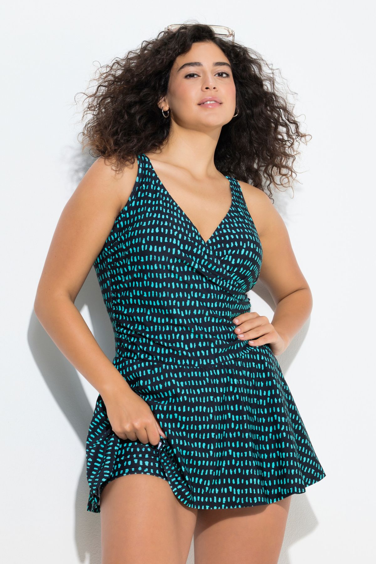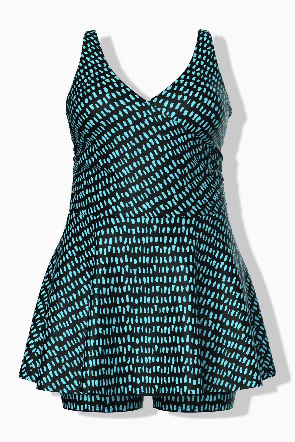 Бански тип рокля с принт на точки и комфортна А - линия на силуета. С оформени чашки, еластична лента под бюста, широки комфортни презрамки и подплата.