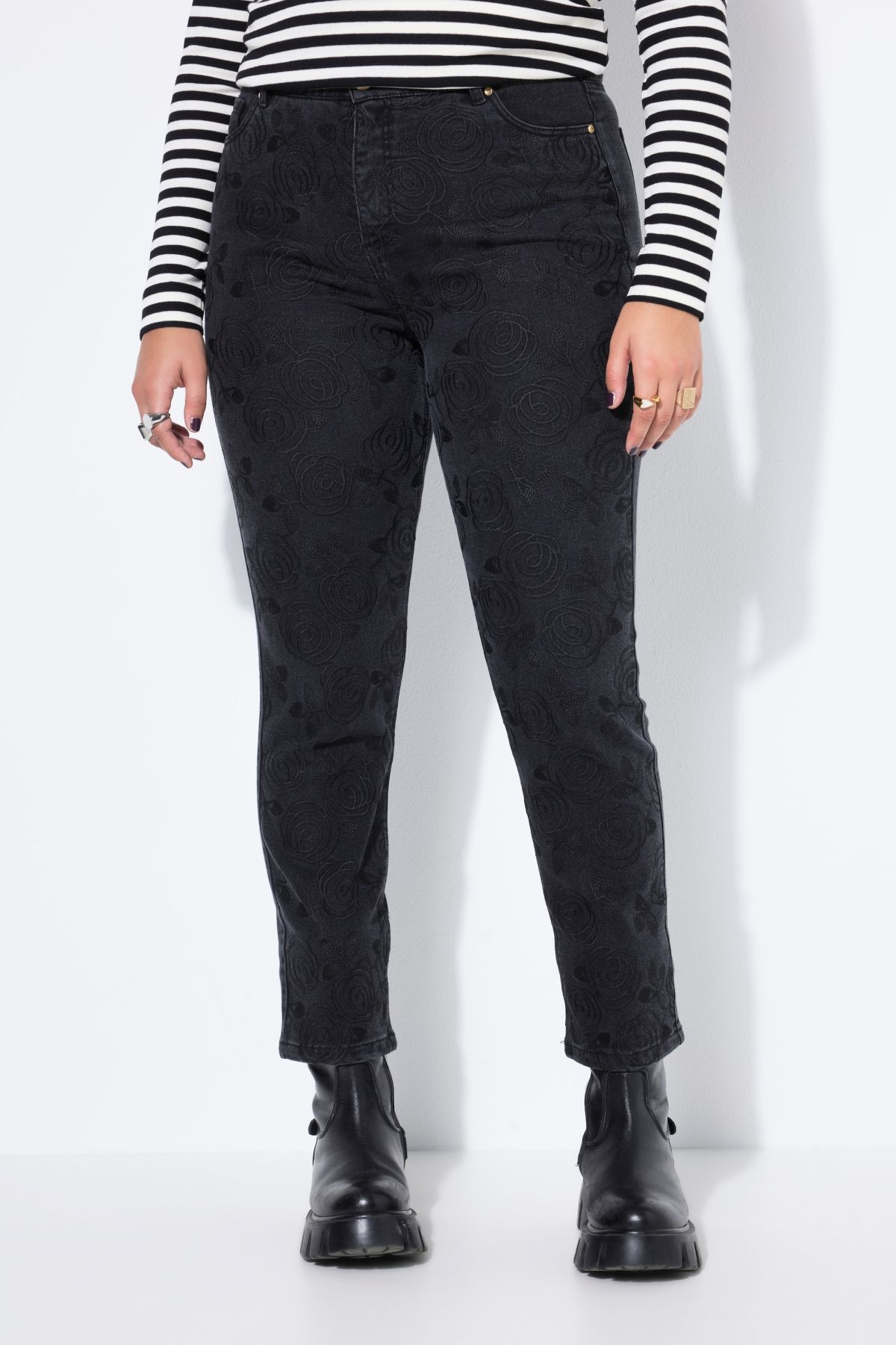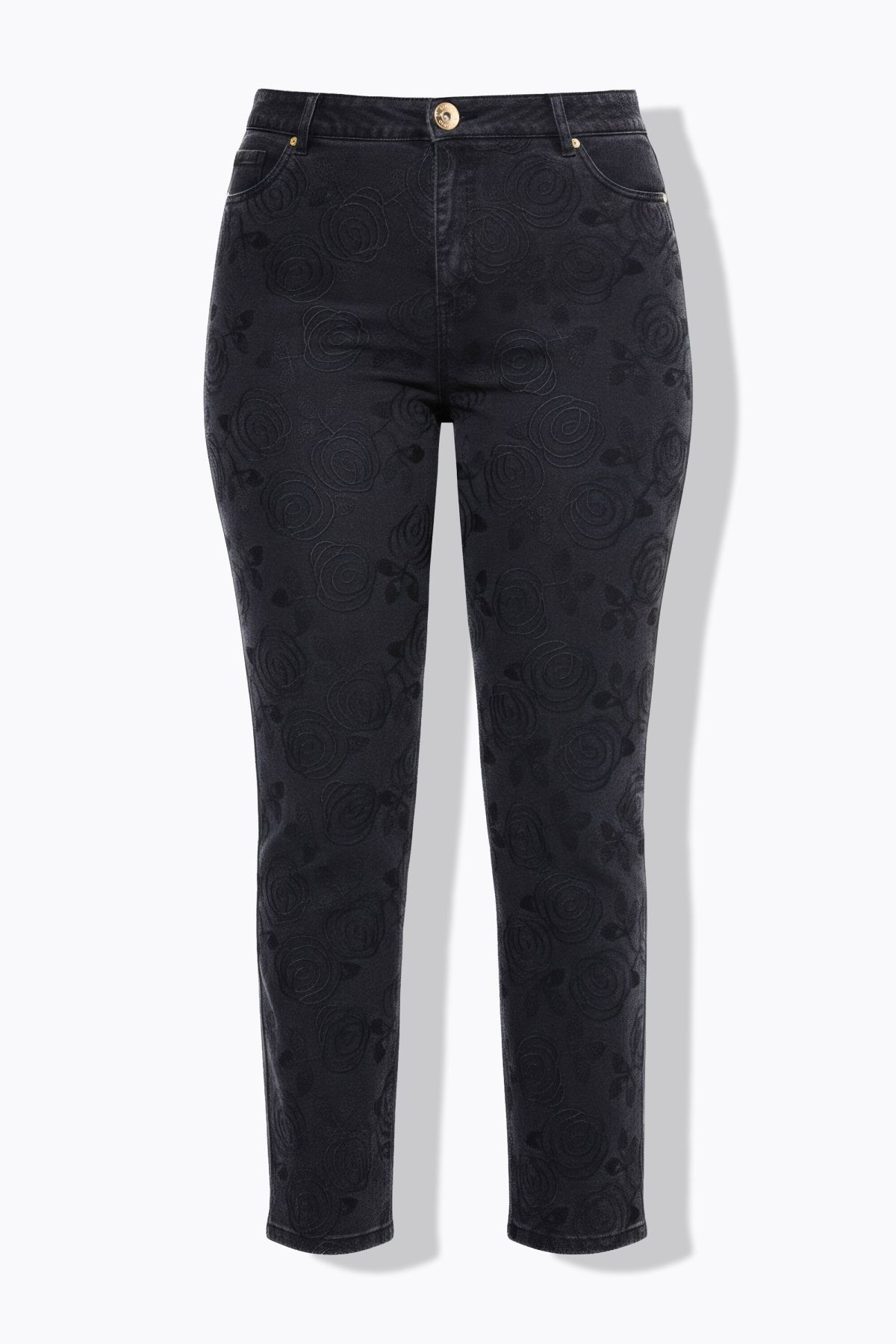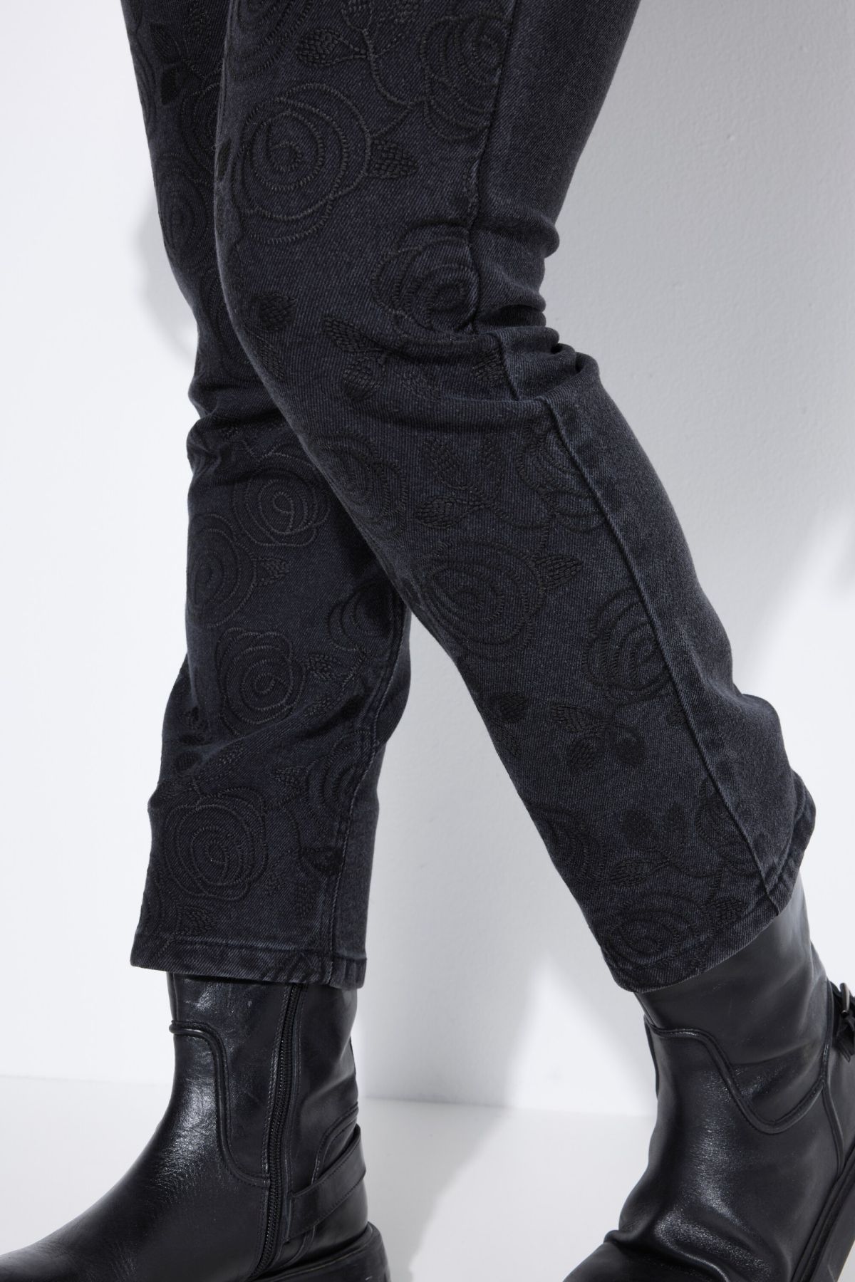 Удобна кройка тип „момче“, приятно еластичен деним, бродерия с цветя в тон отпред, 5 джоба, колан с гайки за колан, вътрешен шев приблизително 74 см.