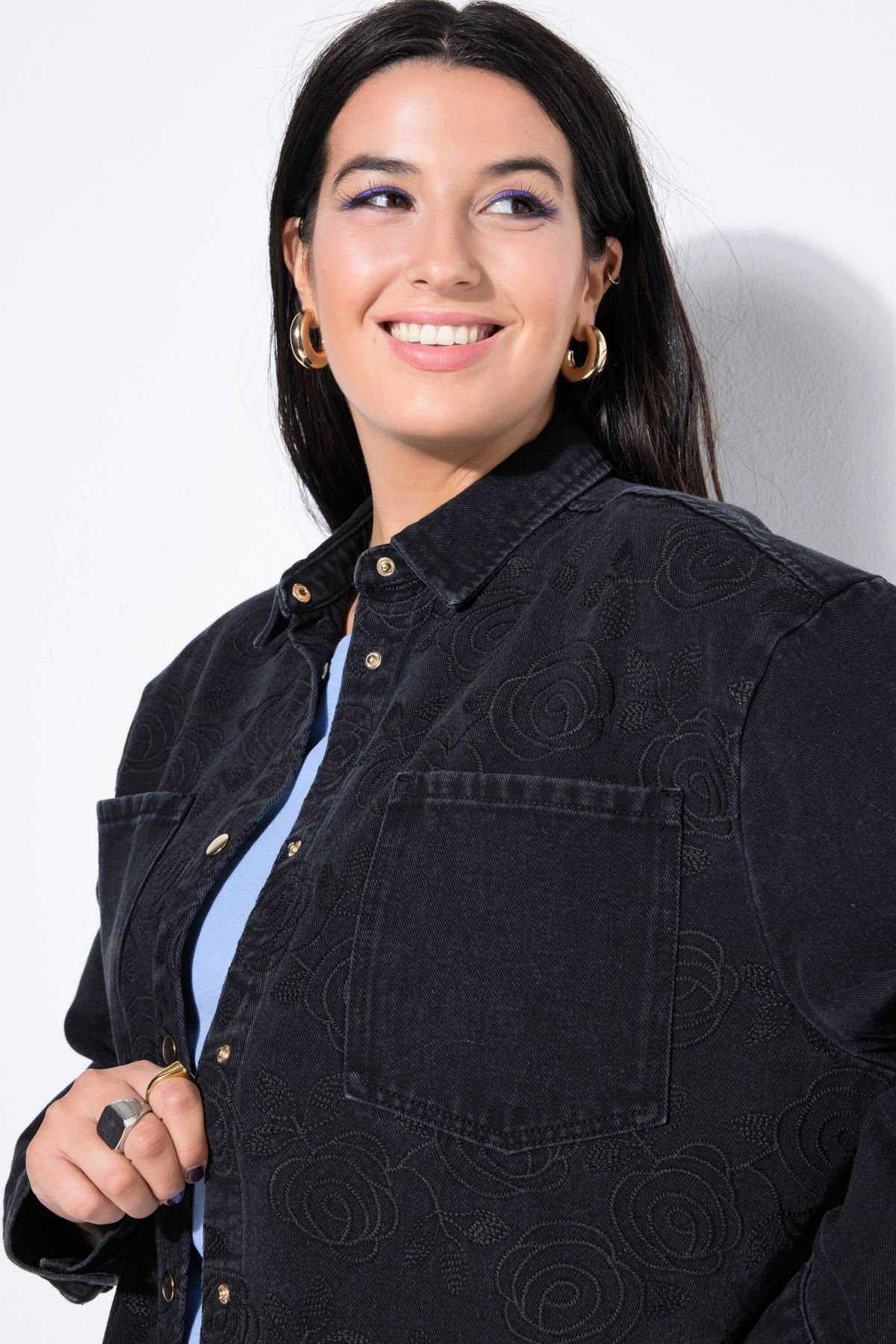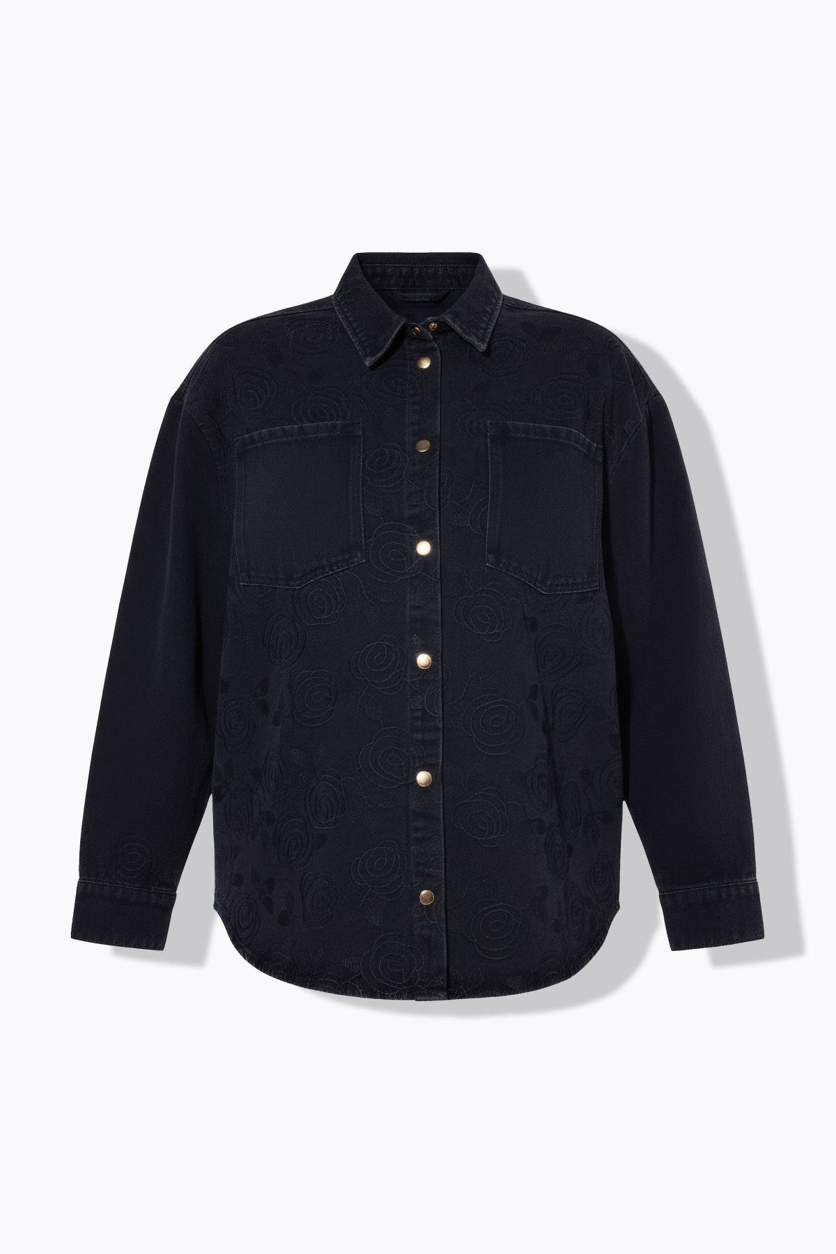 Оувърсайз кройка, мек деним, бродерия с цветя по цялата повърхност, яка на ризата, 2 джоба на гърдите, дължина, регулирана на размер приблизително 78-82 см.