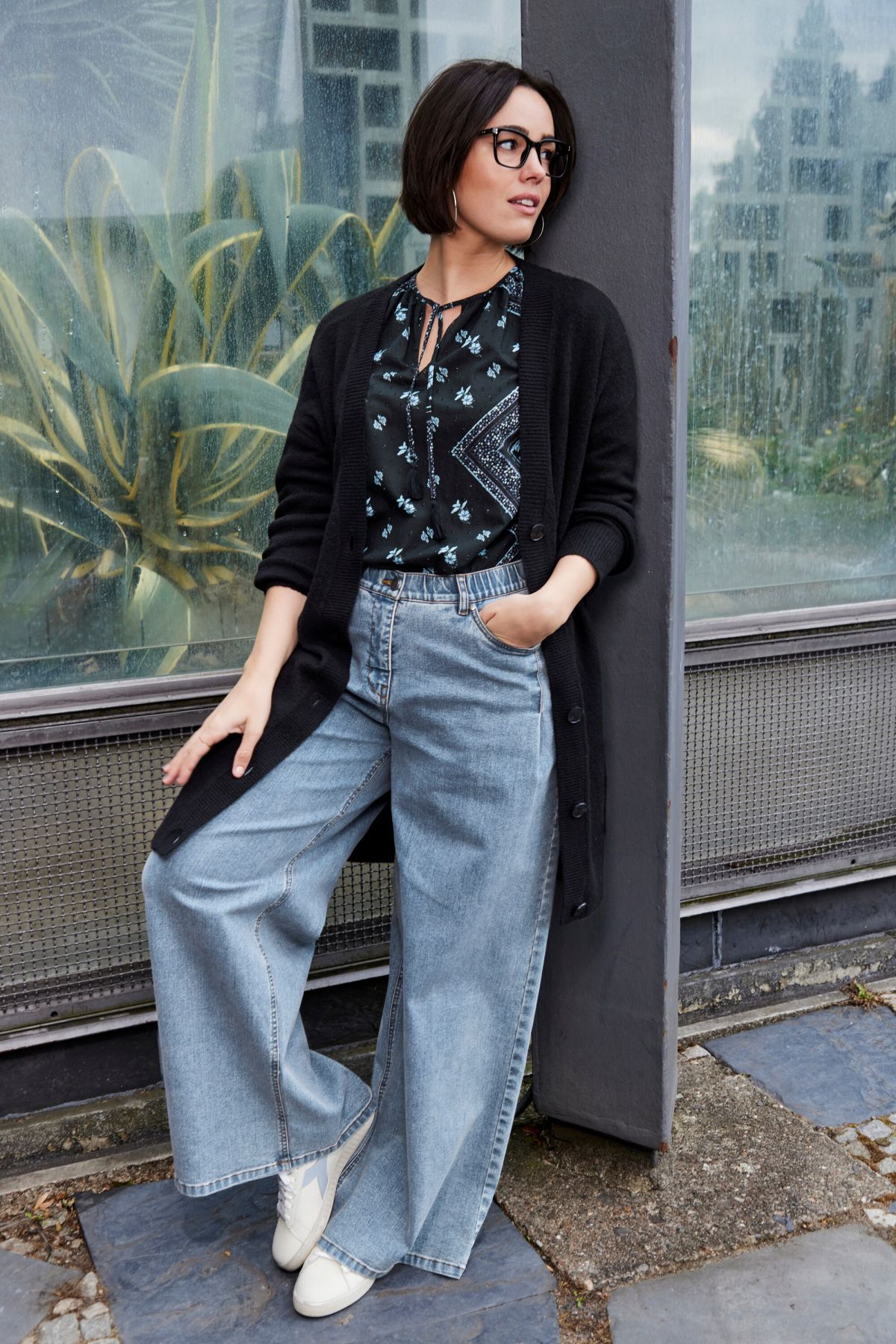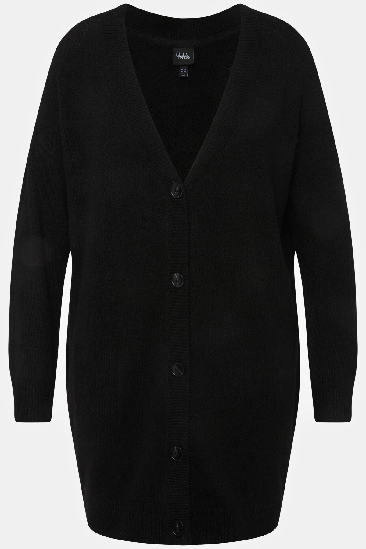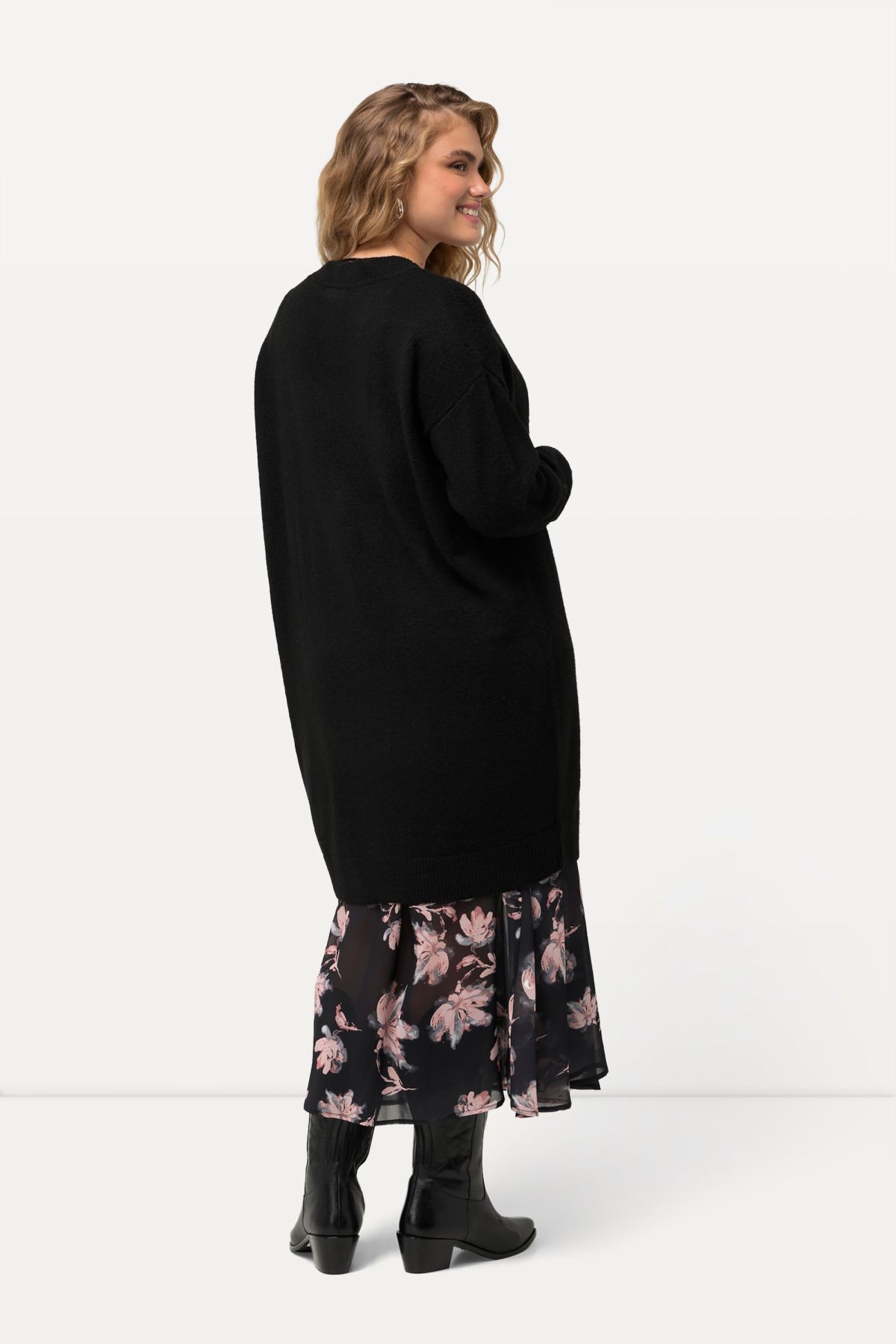 Плетена жилетка от мека, фина плетка с дълга кройка. С копчета отпред и дълги ръкави.