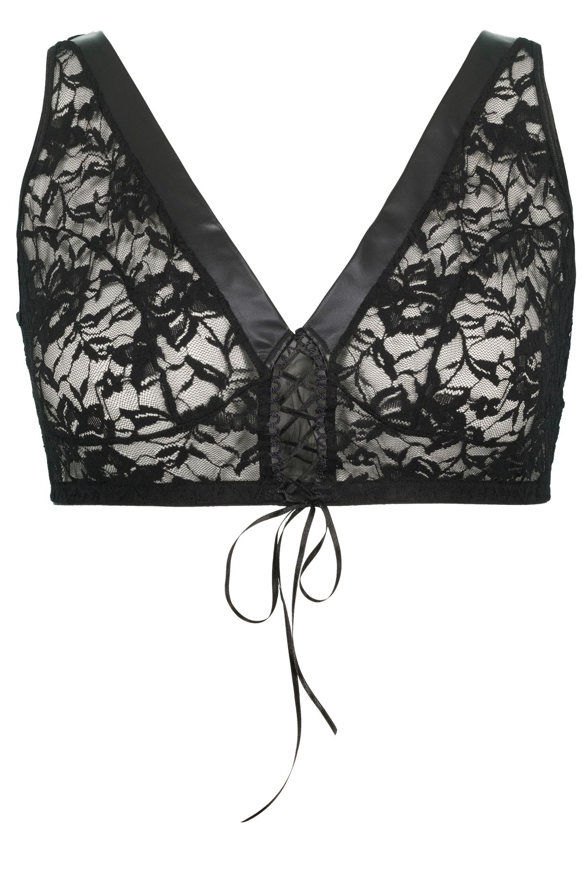 Бюстие от прозрачна флорална дантела с акцент от връзки на бюста. С широки, комфортни презрамки и задно закопчаване с метални кукички.