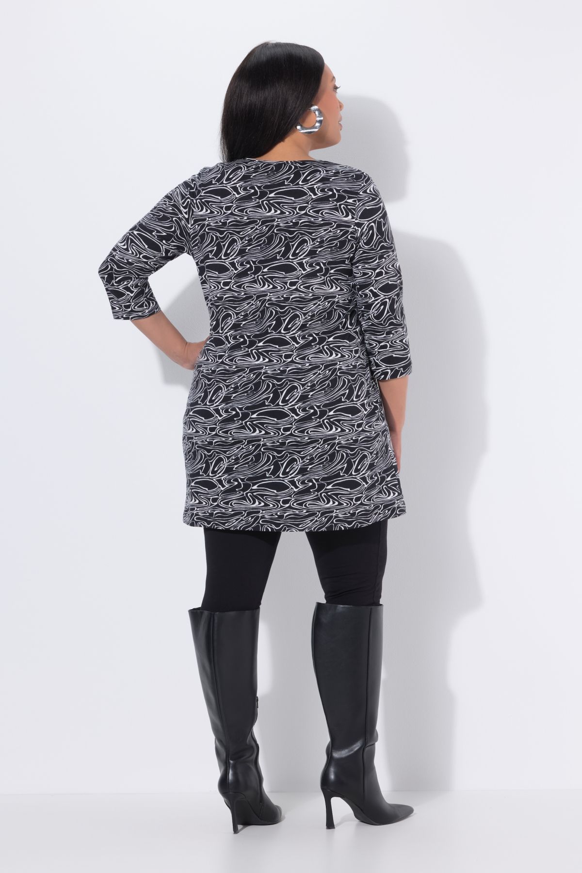 Туника със завъртян принт с кръгло деколте с цепка, шев на талията, А - линия на силуета и 3/4 ръкави и странични джобове.