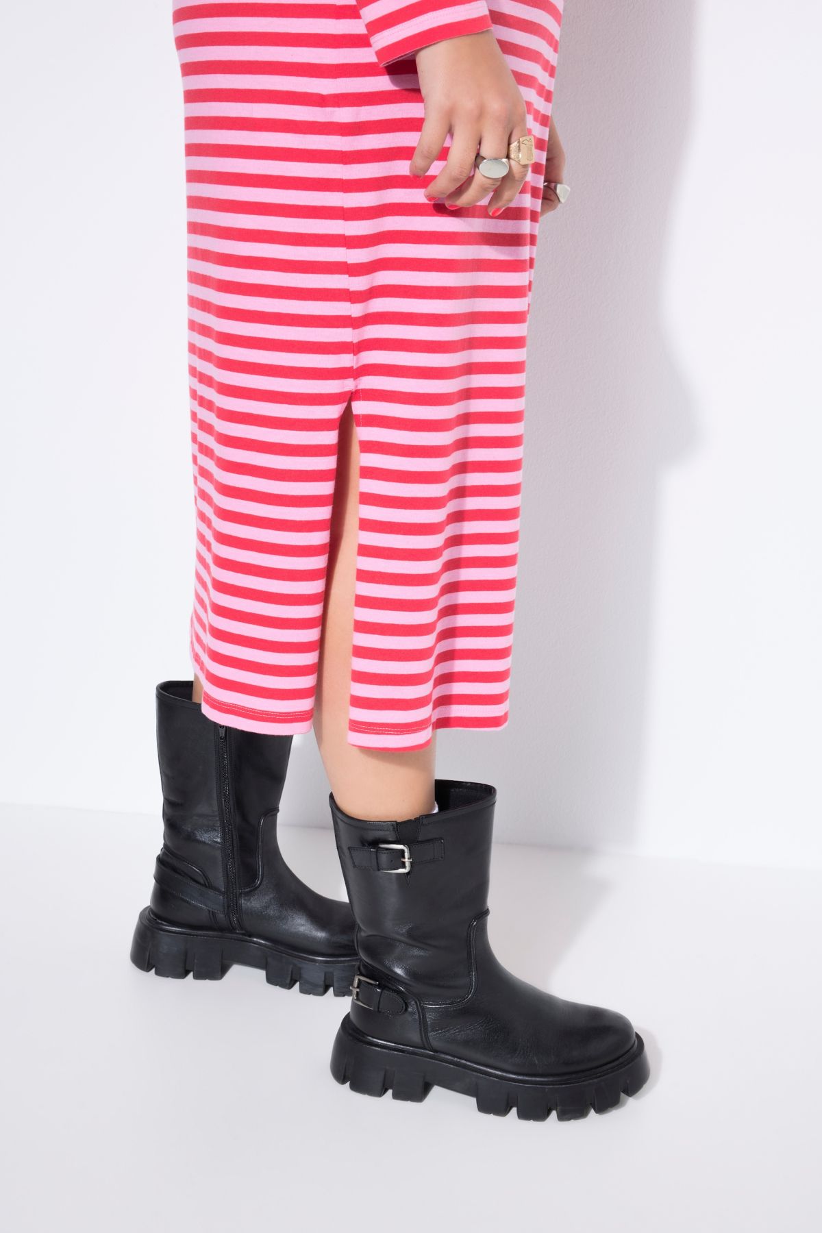 Трикотажна рокля с райета с класически стил, който да добавите в гардероба си. С кръгло деколте и дълги ръкави.