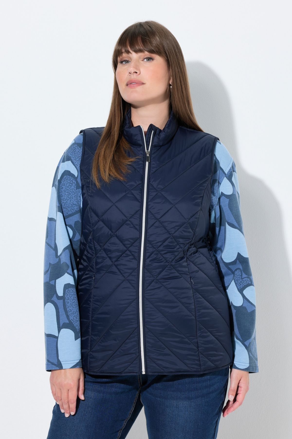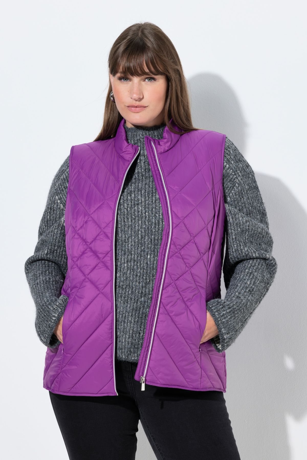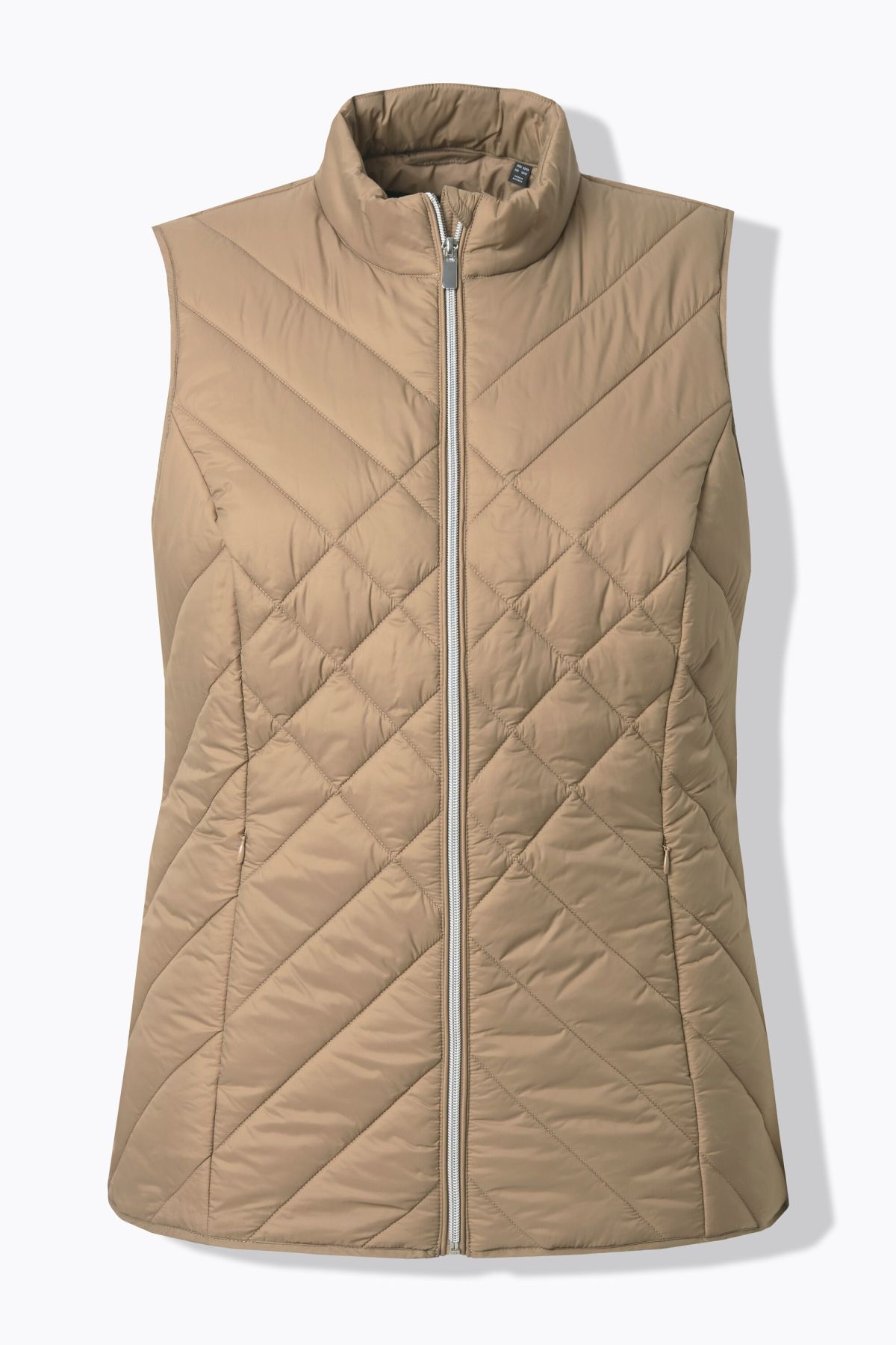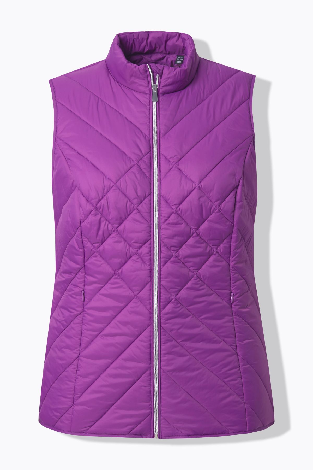 Ватиран елек със спортна визия - лек и топъл с пълнеж от вата. С водонепромокаем завършек на материята. С изправена яка, цип отпред и странични джобове.