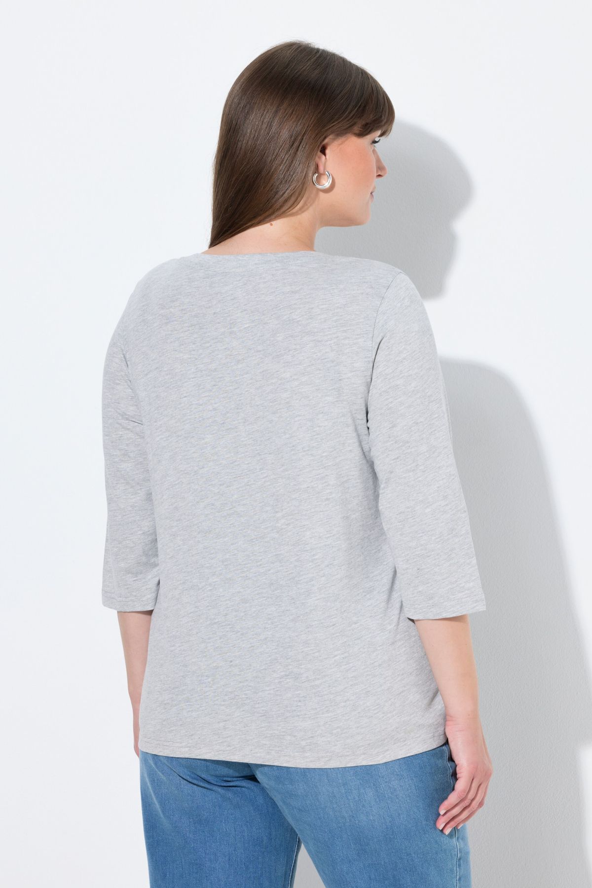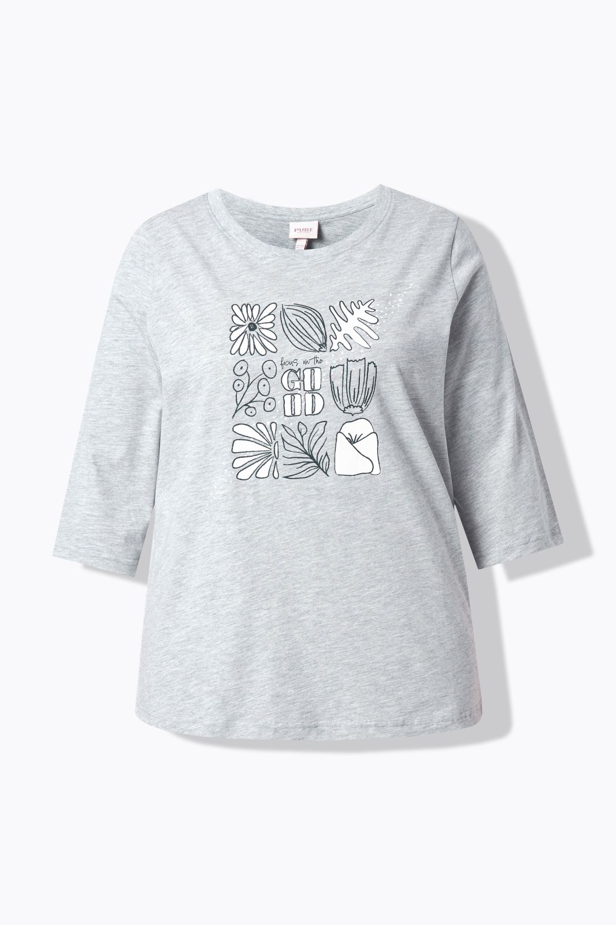 Предна част с декоративен мотив на листа, кръгло деколте, удобна кройка със странични цепки, 3/4 ръкави, устойчив органичен памук, дължина, регулирана по размер, приблизително 68-76 см.