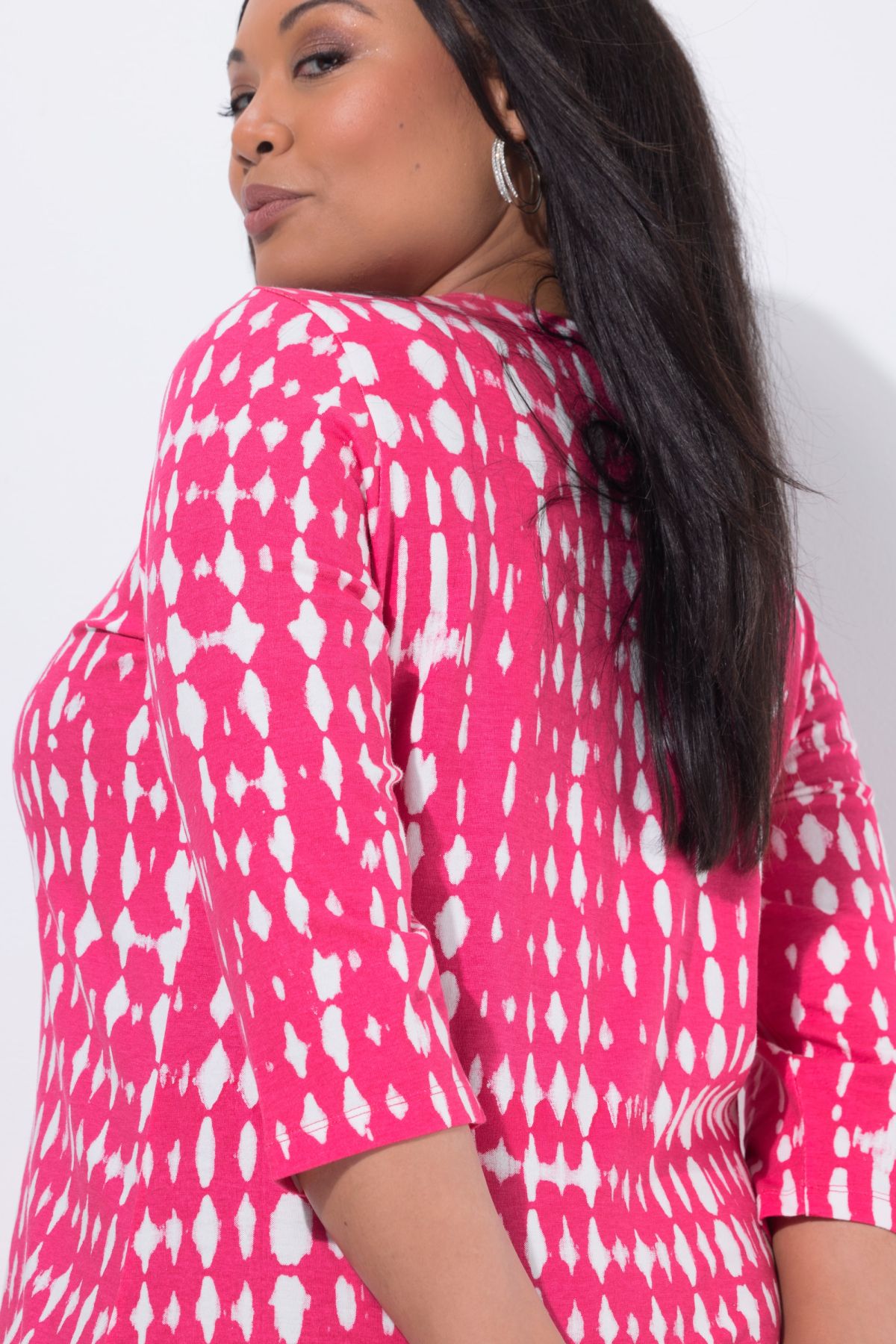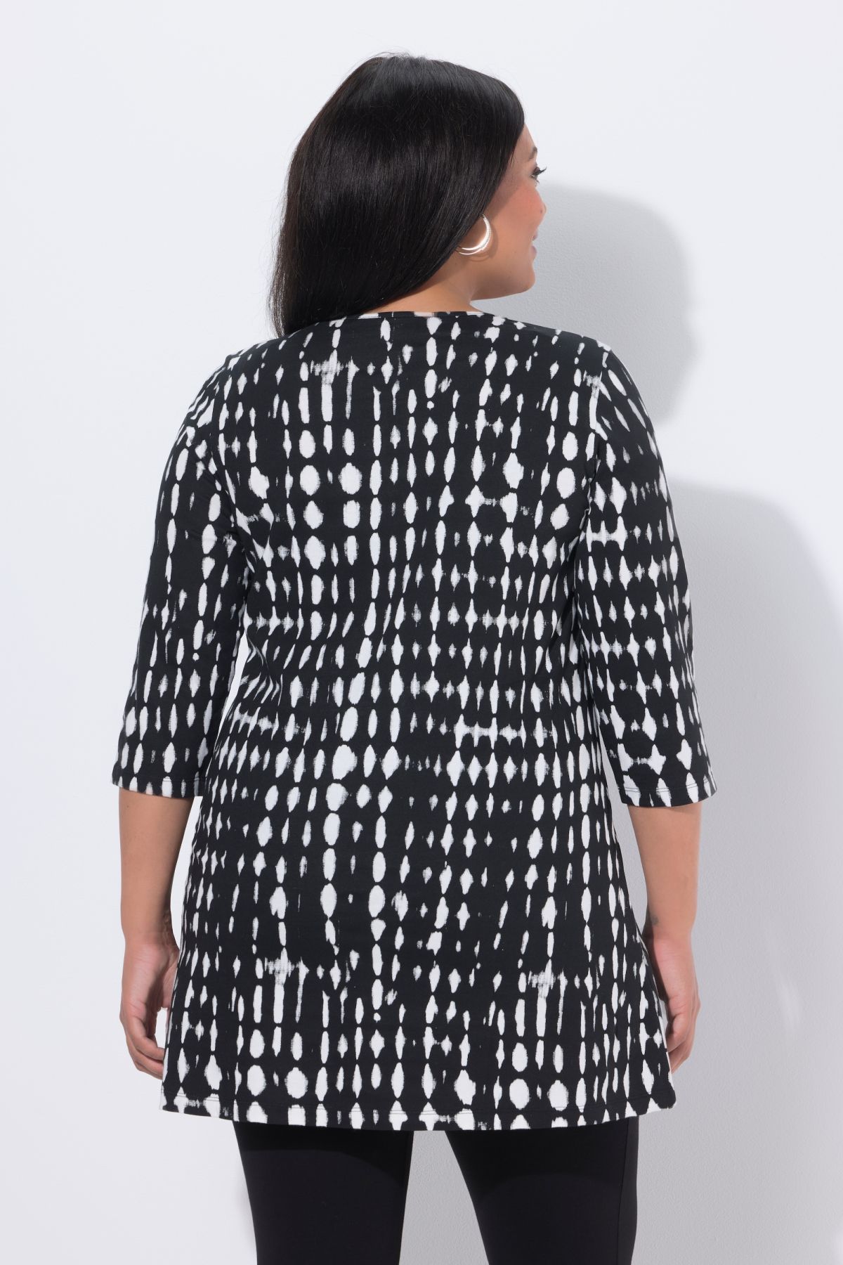 модерен батиков модел, кръгло деколте с малък изрез, по-дълъг А-силует с удобно широк подгъв, 3/4 ръкави, чист памук, дължина приблизително 86 см.