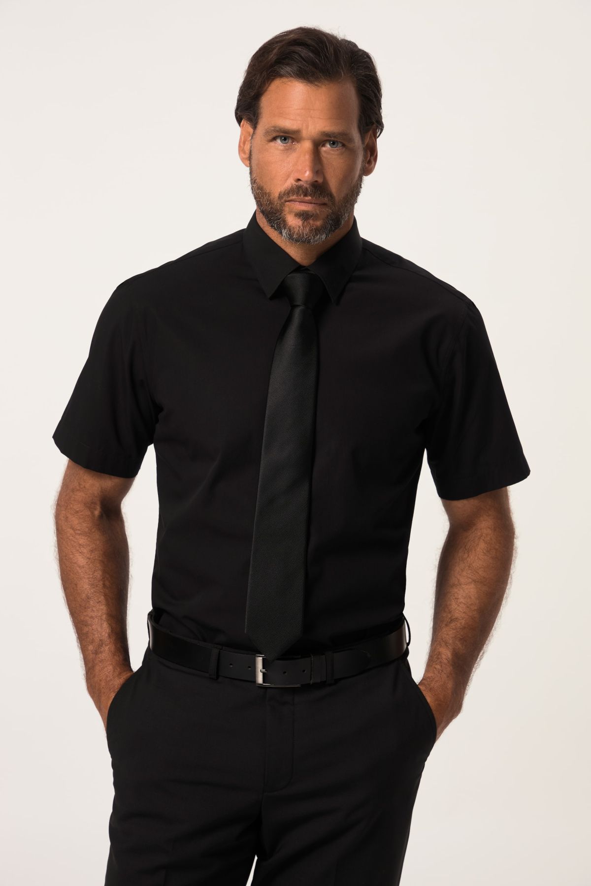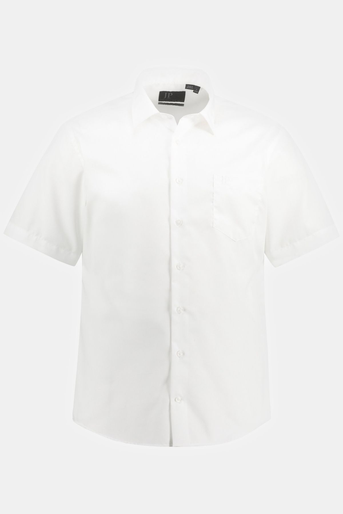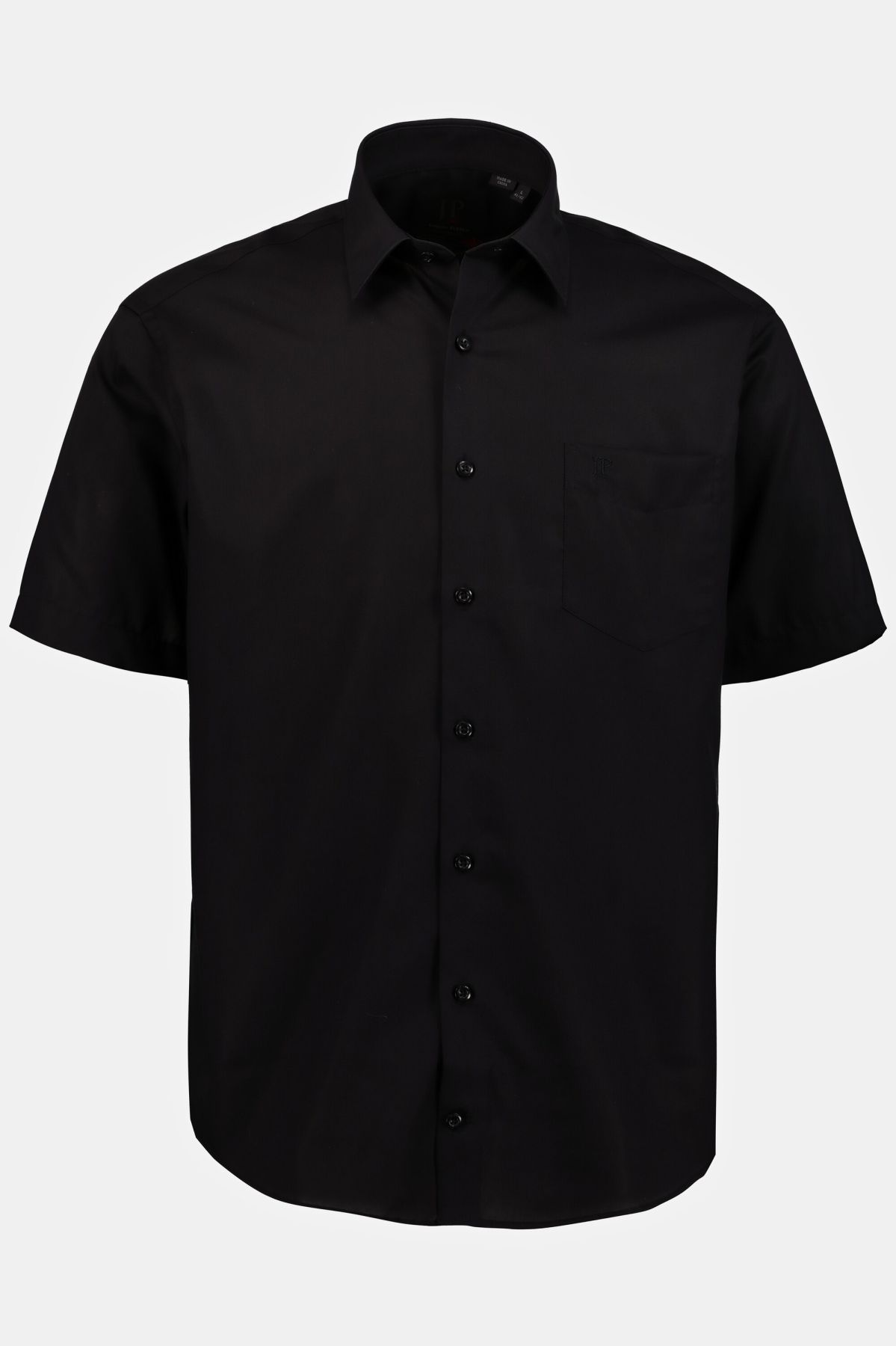 Риза с яка и модерна визия. От комфортна, лесна за поддържане памучна материя. С копчета, къси ръкави с маншет с копче и обърнато плисе на гърба. С модерна визия и заоблен подгъв.