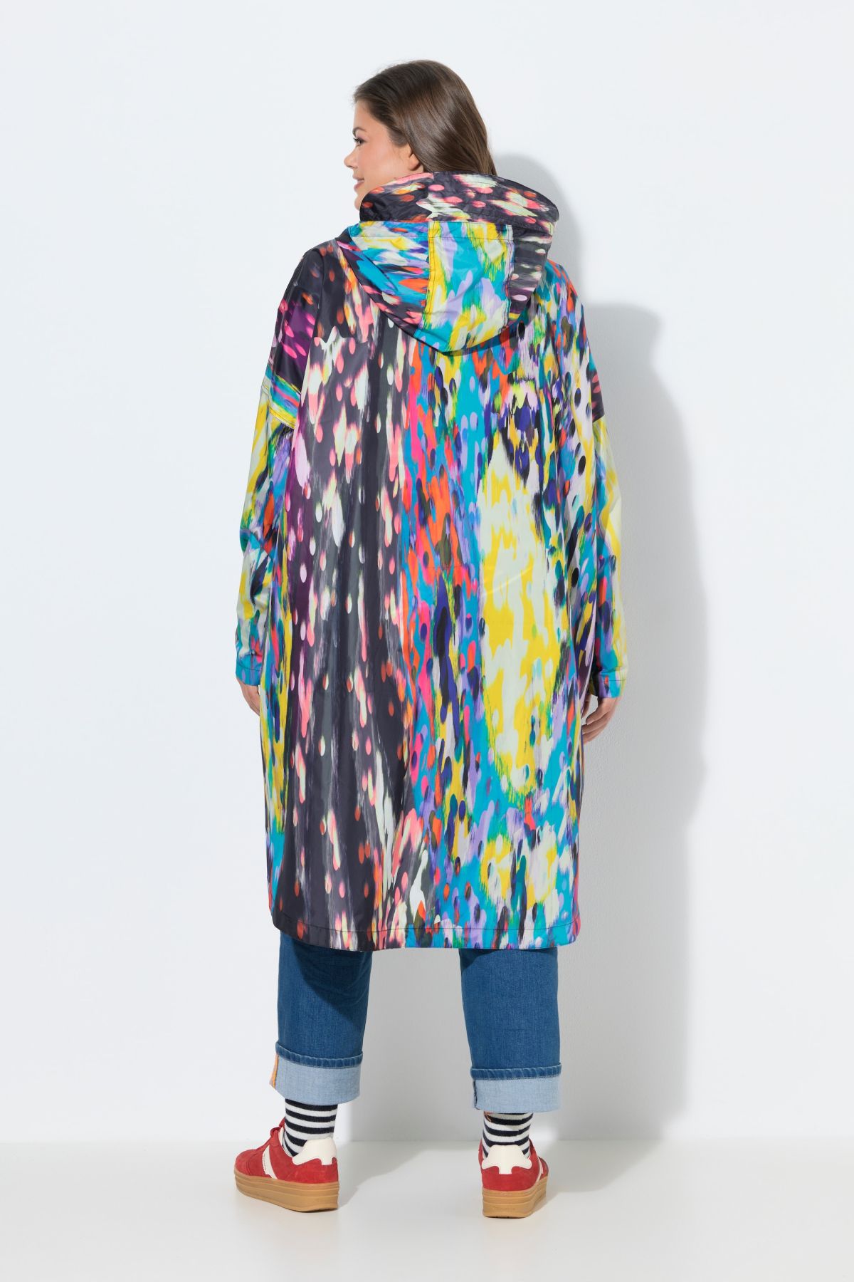 Дъждобран с абстрактен принт тип пончо. Дълги ръкави с ластичен маншет, закопчаване с цип в горната част и регулируема качулка с козирка. Странични джобове и странични цепки с тик-так закопчаване.