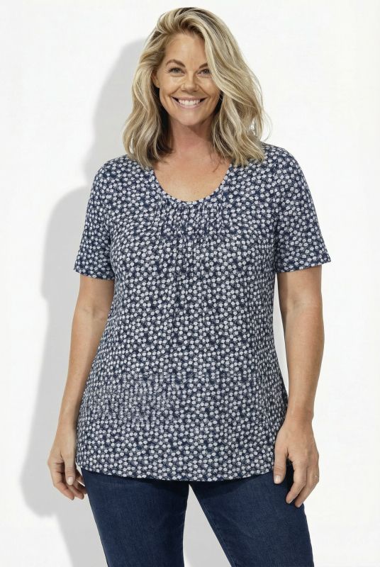 A-line T-shirt with a comfortable hem width, made from soft jersey with a small pattern. Round neck, decorative pleats at the front, short sleeves.