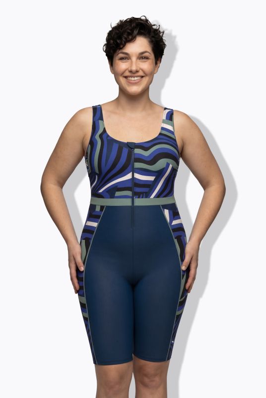Retro Print Unitard Swimsuit - A sporty, full coverage pick with a colorful, retro-inspired wave print.