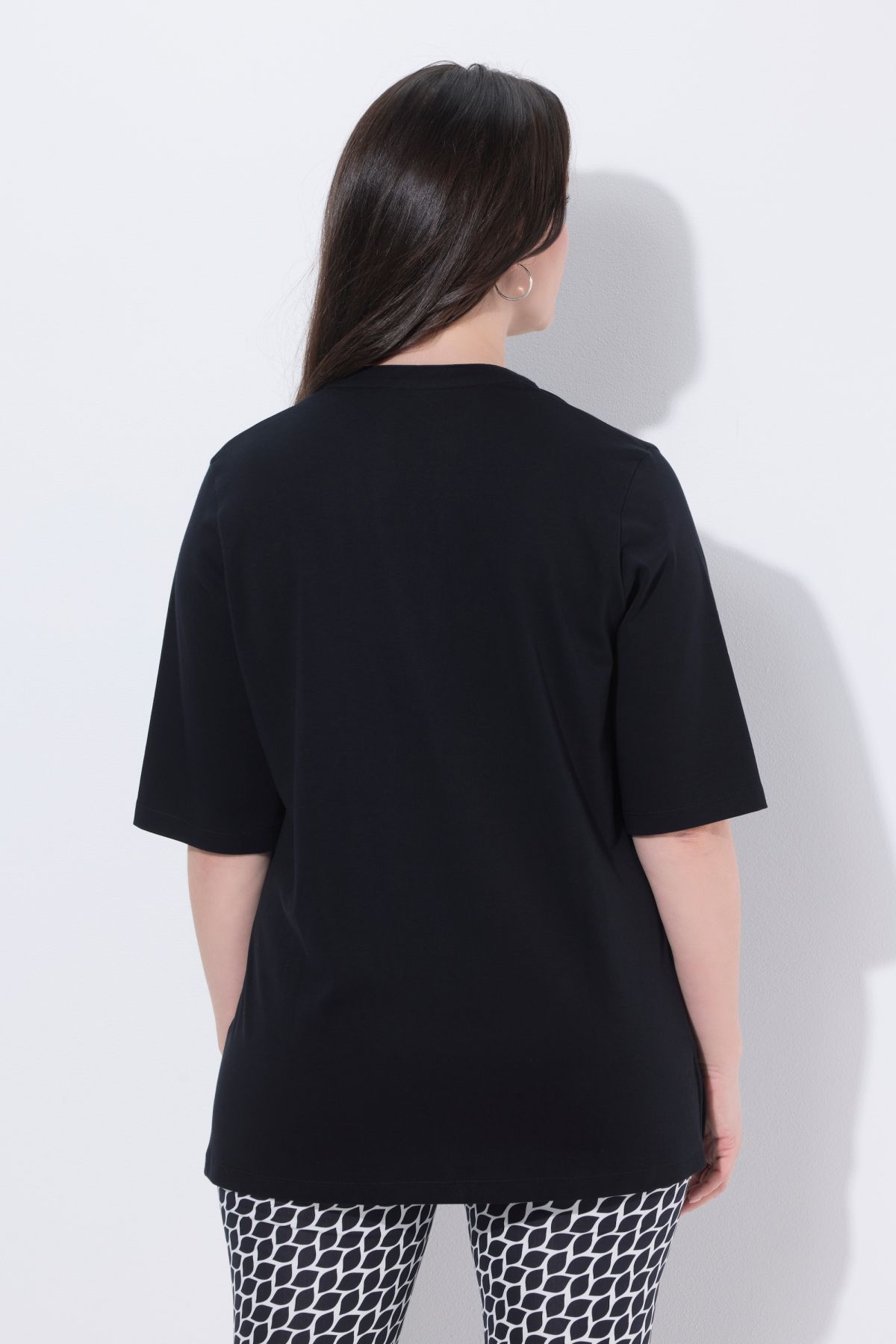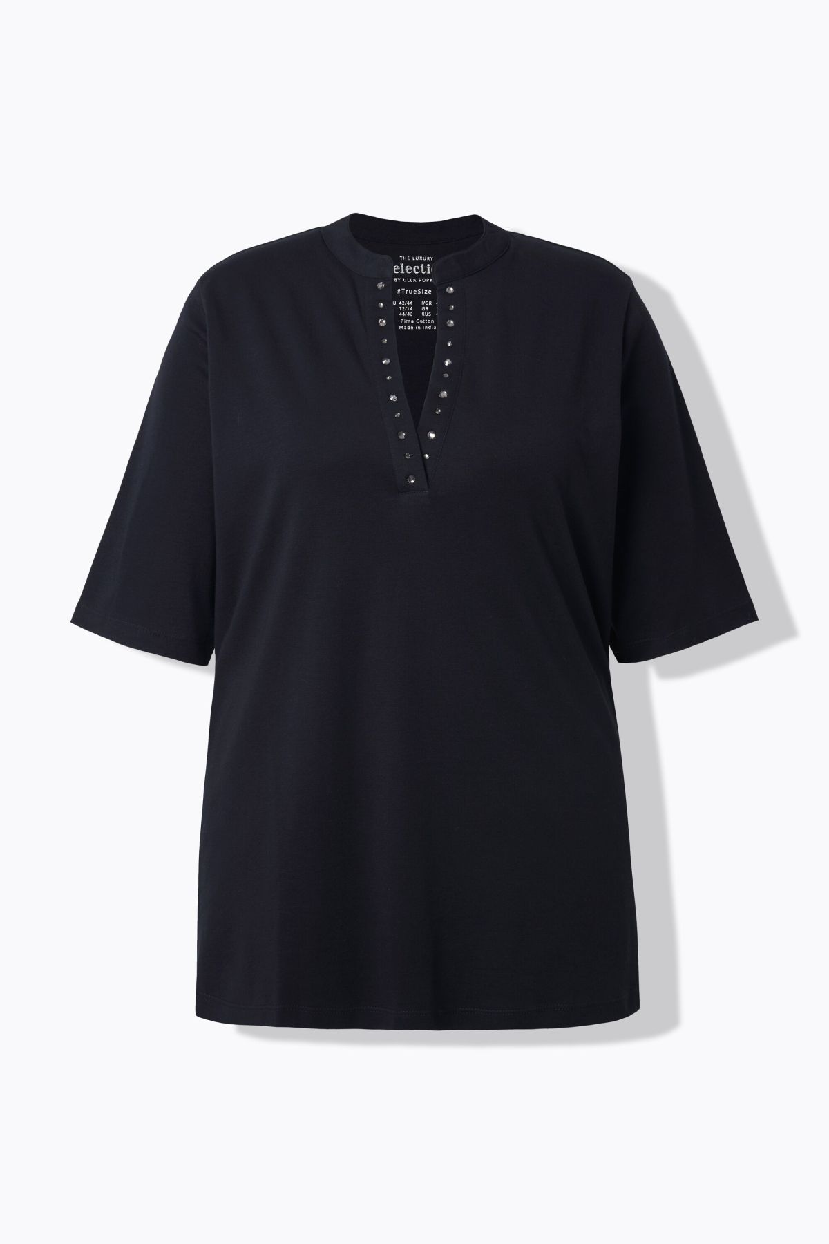 Pima cotton shirt, classic fit, made from exceptionally high-quality, extra-soft Pima cotton. Stand-up collar with rhinestones on the V-neck placket. Short sleeves, side slits for added comfort. Pima cotton is also known as the silk of South America due to its fantastic properties. This sophisticated cotton variety is characterized by its particularly long and fine fibers. This makes it exceptionally soft and durable, giving it a silky sheen – ideal for people with sensitive skin. Premium fashion for you! Selection by Ulla Popken stands for quality and wearable elegance. Selection by Ulla Popken transforms classics into modern highlights using high-quality materials with elaborate prints and details – perfect for everyday wear and special occasions!