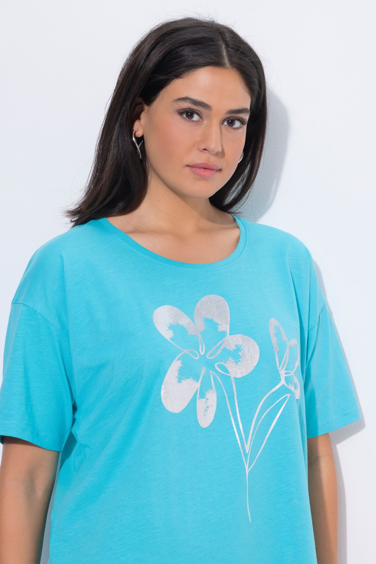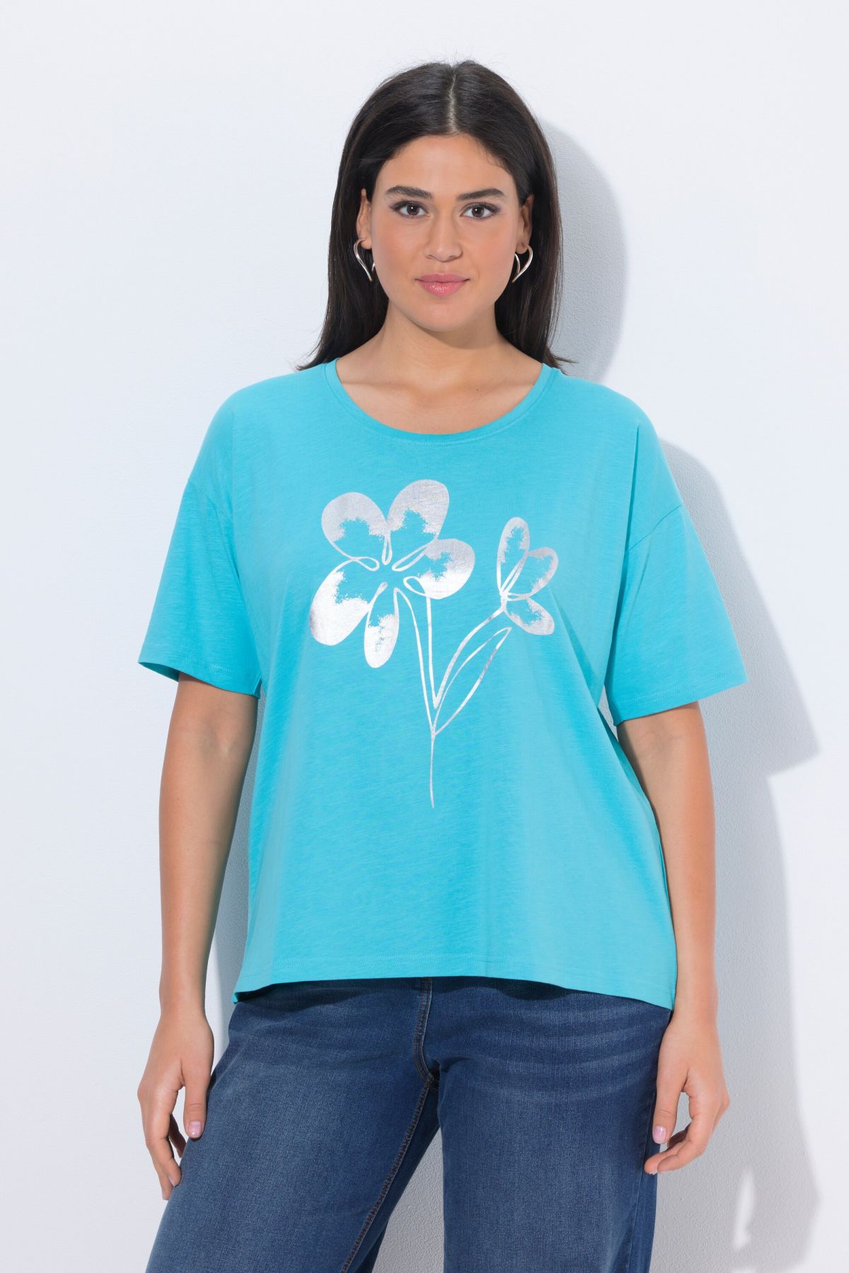 T-shirt, casually oversized, made of soft jersey with a floral print. V-neck, dropped shoulders, half sleeves with turn-up cuffs.