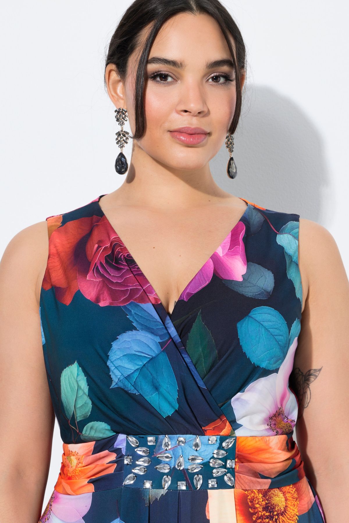 Maxi dress, sleeveless A-line, with a floral print. Feminine draped top with a V-neck and decorative stones on the waistband – ties at the back for your desired silhouette. Full skirt with side seam pockets.