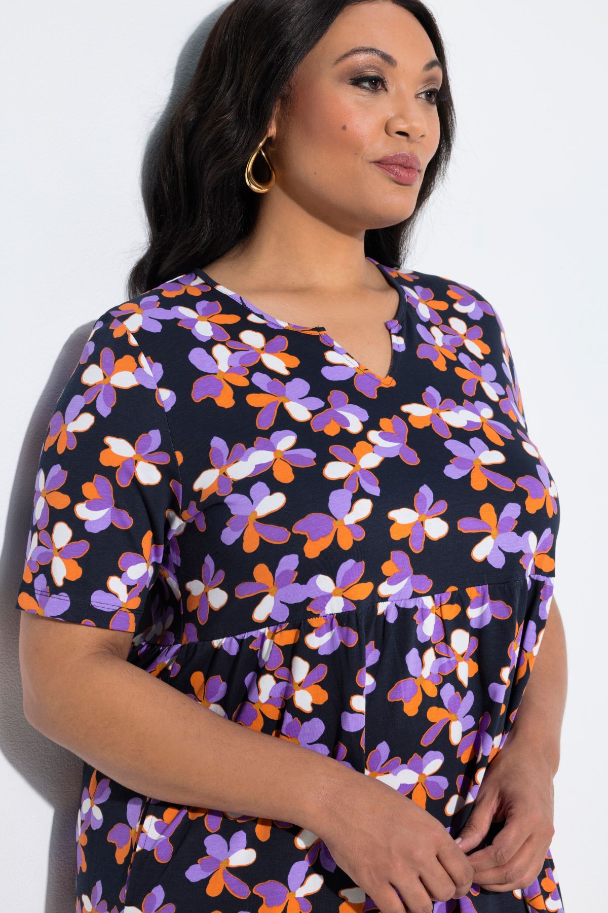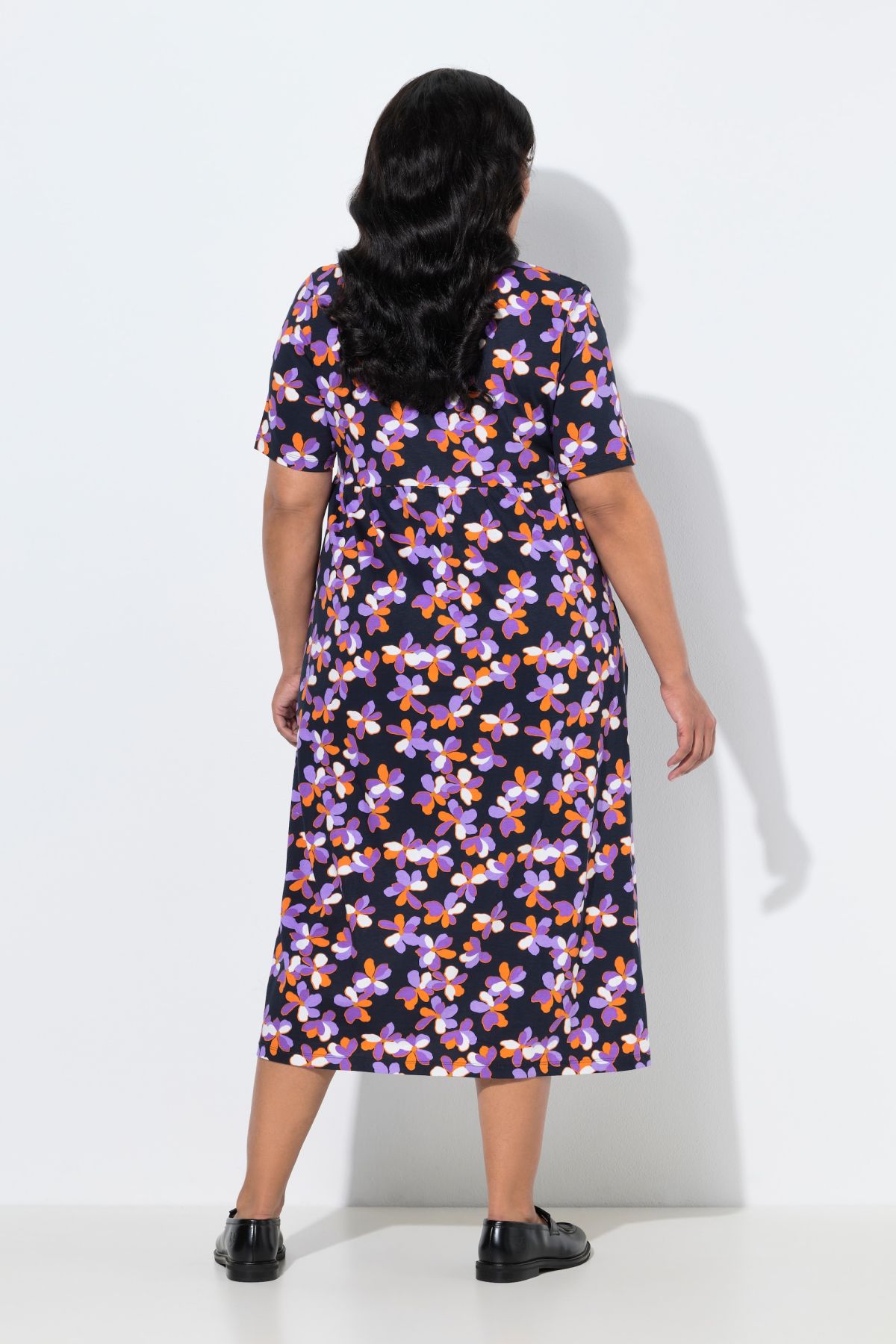 Jersey maxi dress, A-line, with a beautiful pattern. Comfortable fit with a tunic neckline and elasticated empire waist. Half sleeves, side seam pockets.