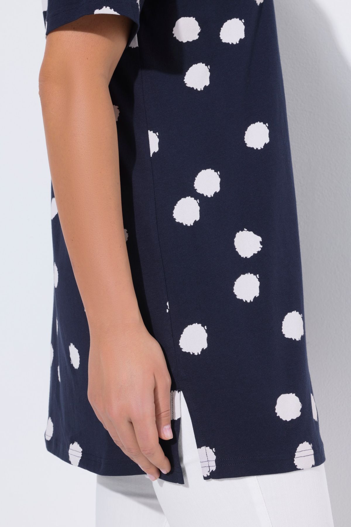 Long shirt, A-line with comfortable hem width, made of soft jersey with dots, square neckline and half sleeves.