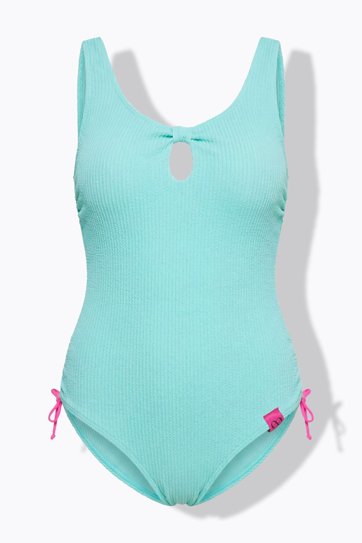 Summer vibes! This swimsuit impresses with its extraordinary sea sugar texture and striking neckline that immediately catches the eye.