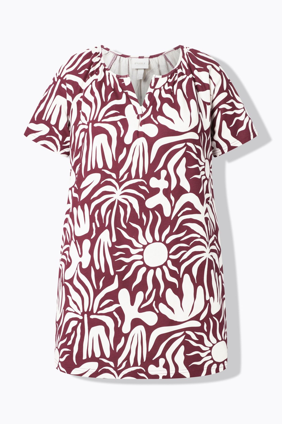 модерен мотив на листа, деколте с волани от туника, А-силует с удобен подгъв, къси ръкави тип реглан, устойчив органичен памук, дължина, регулирана по размер, приблизително 80-84 см.