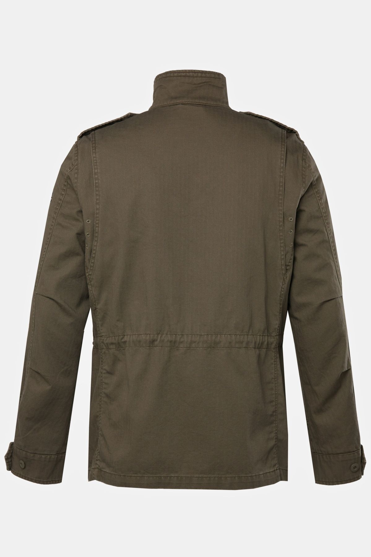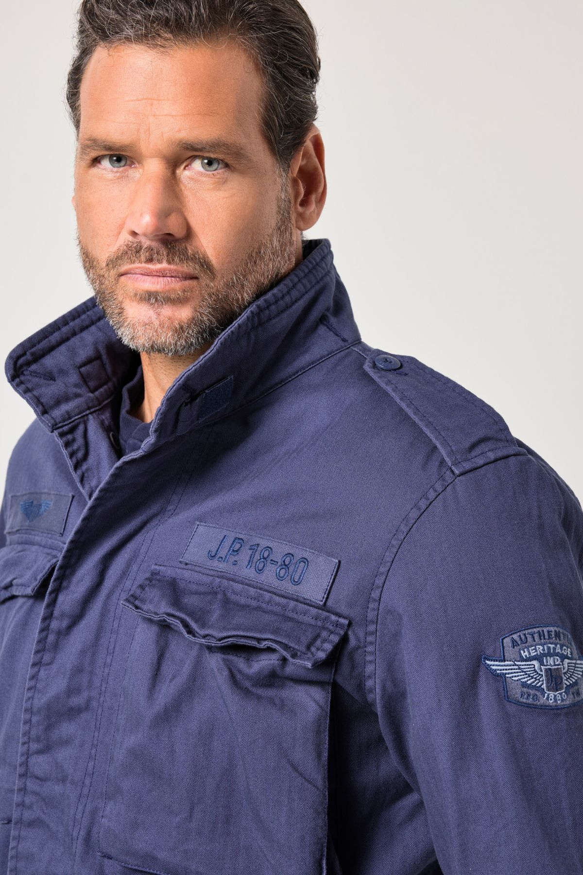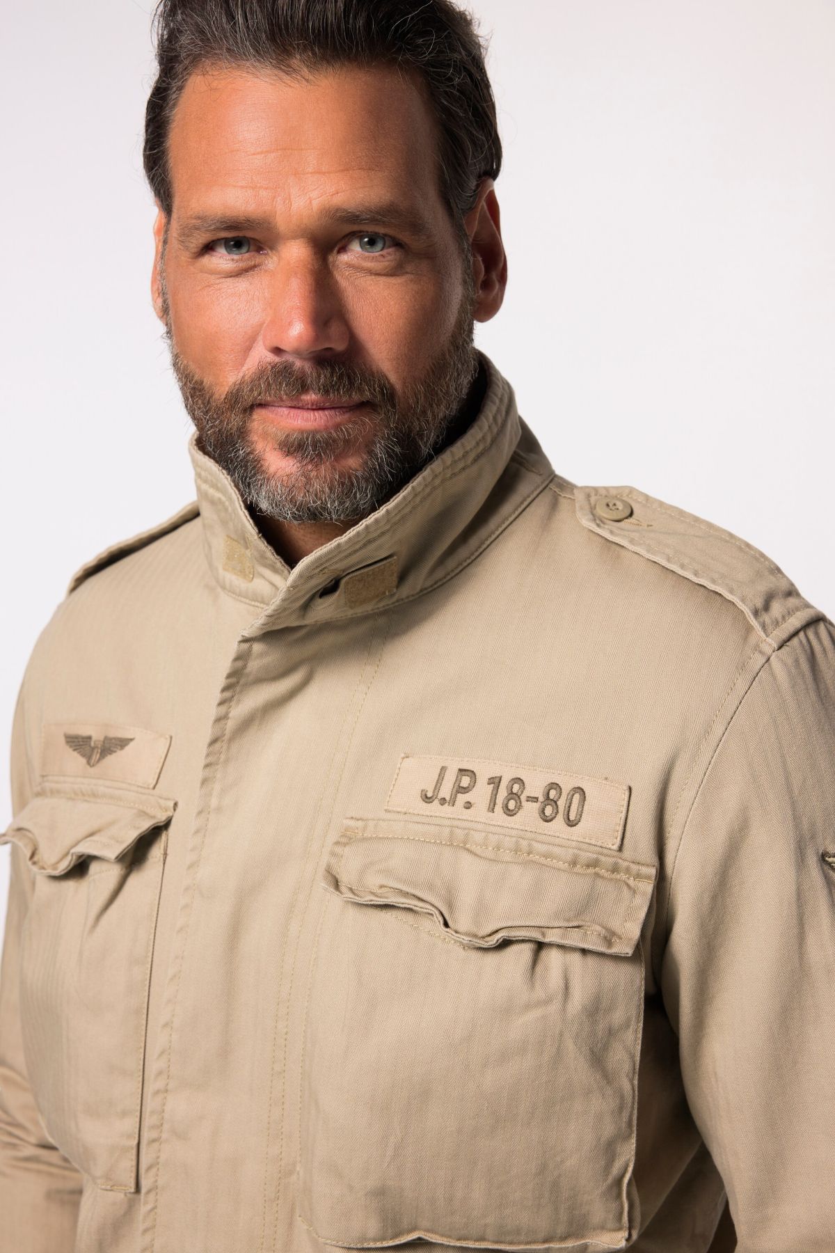 Яке от мека, памучна материя с винтидж визия. С външни джобове с капаци на гърдите, изправена яка, пагони на раменете, дълги ръкави. С цип и копчета отпред.