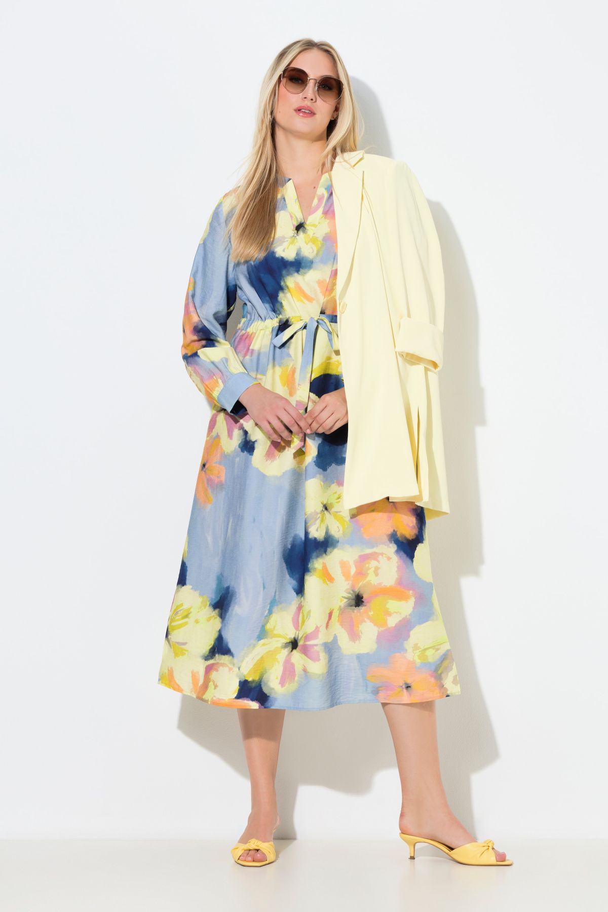 Рокля с акварелен флорален принт. С V - образно деколте, шевов акцент с връзка на талията и дълги ръкави с маншет. От лека, прохладна материя.