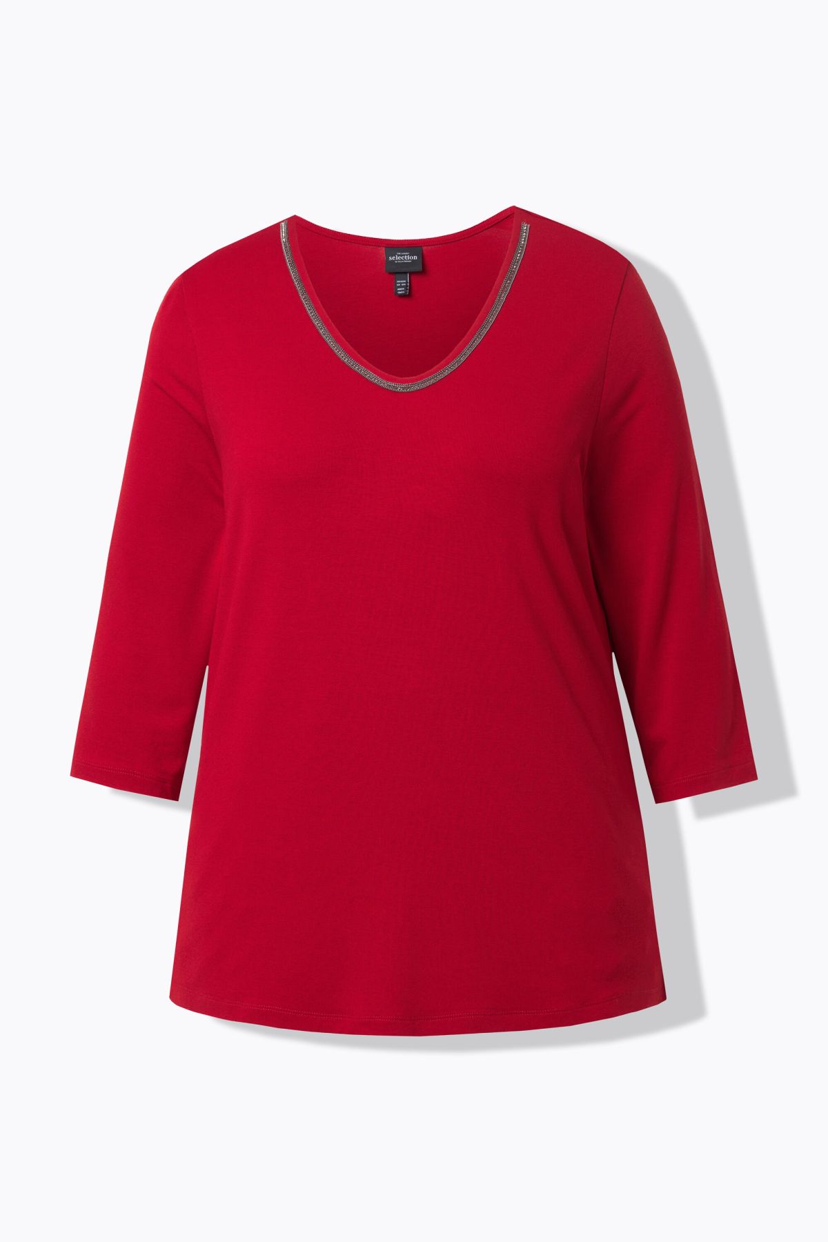 Тениска с камъчета на кръглото деколте с класически силует. С 3/4 ръкави. Перфектният избор за всеки повод