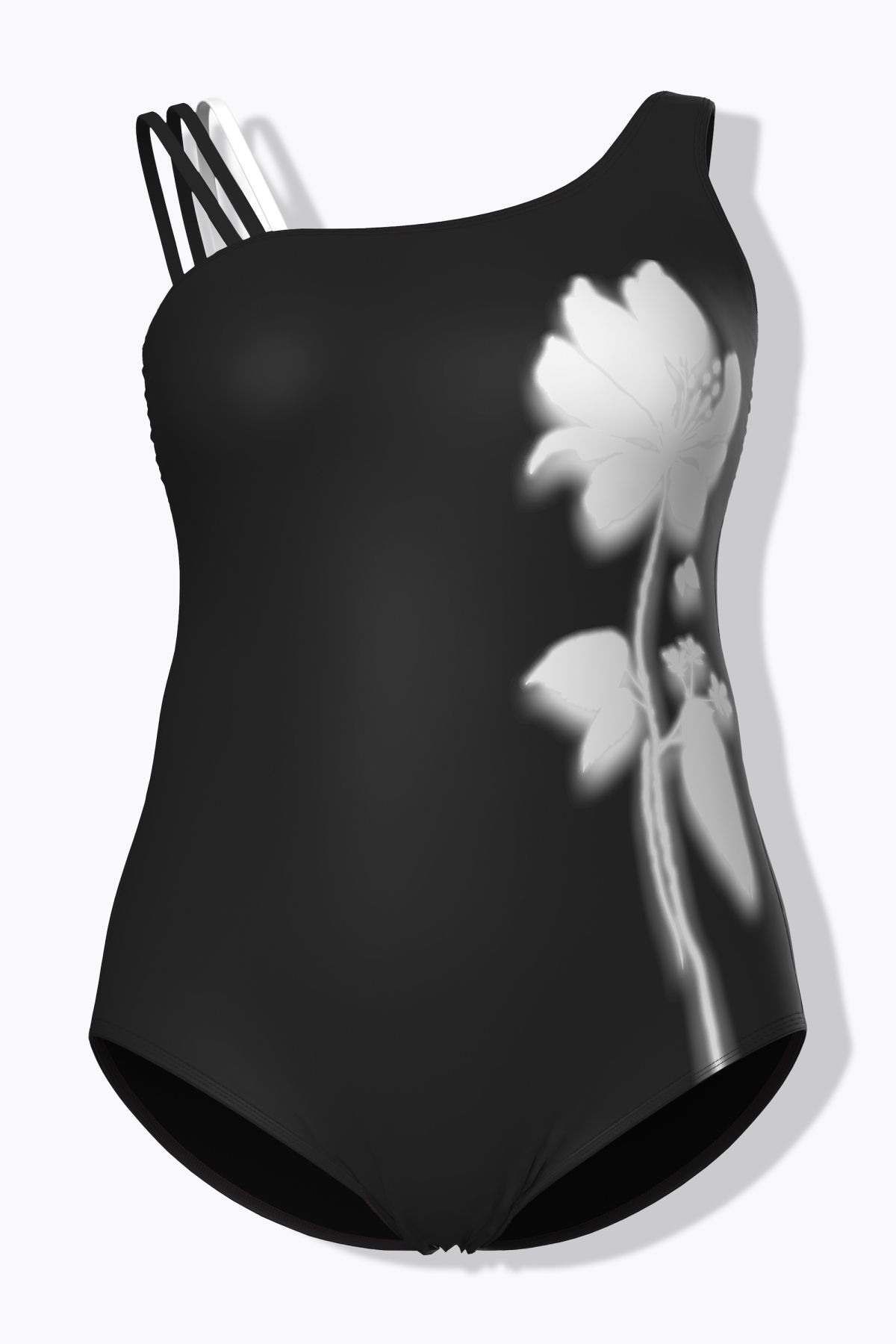 Бански с флорален принт с елегантна черно бяла визия. С детайл на презрамките - едната е от 3 ленти, а другата широка. С кръгло деколте, оформени чашки, лента под бюста за поддържане и подплата отпред. Изработен от рециклиран полиамид.
