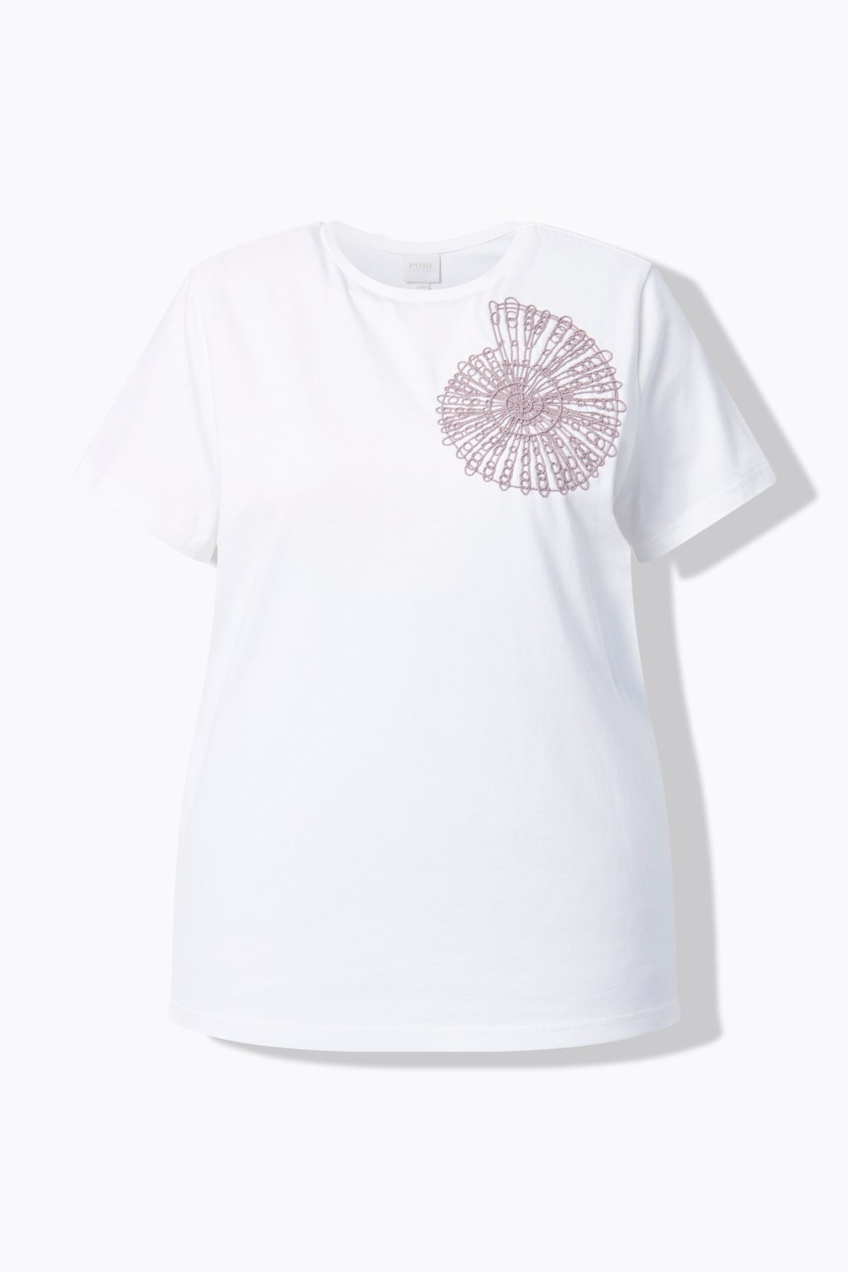 Тениска с бродерия на раковина. Със свободна кройка, кръгло деколте и къси ръкави. Със странични цепки на подгъва за допълнителен комфорт.