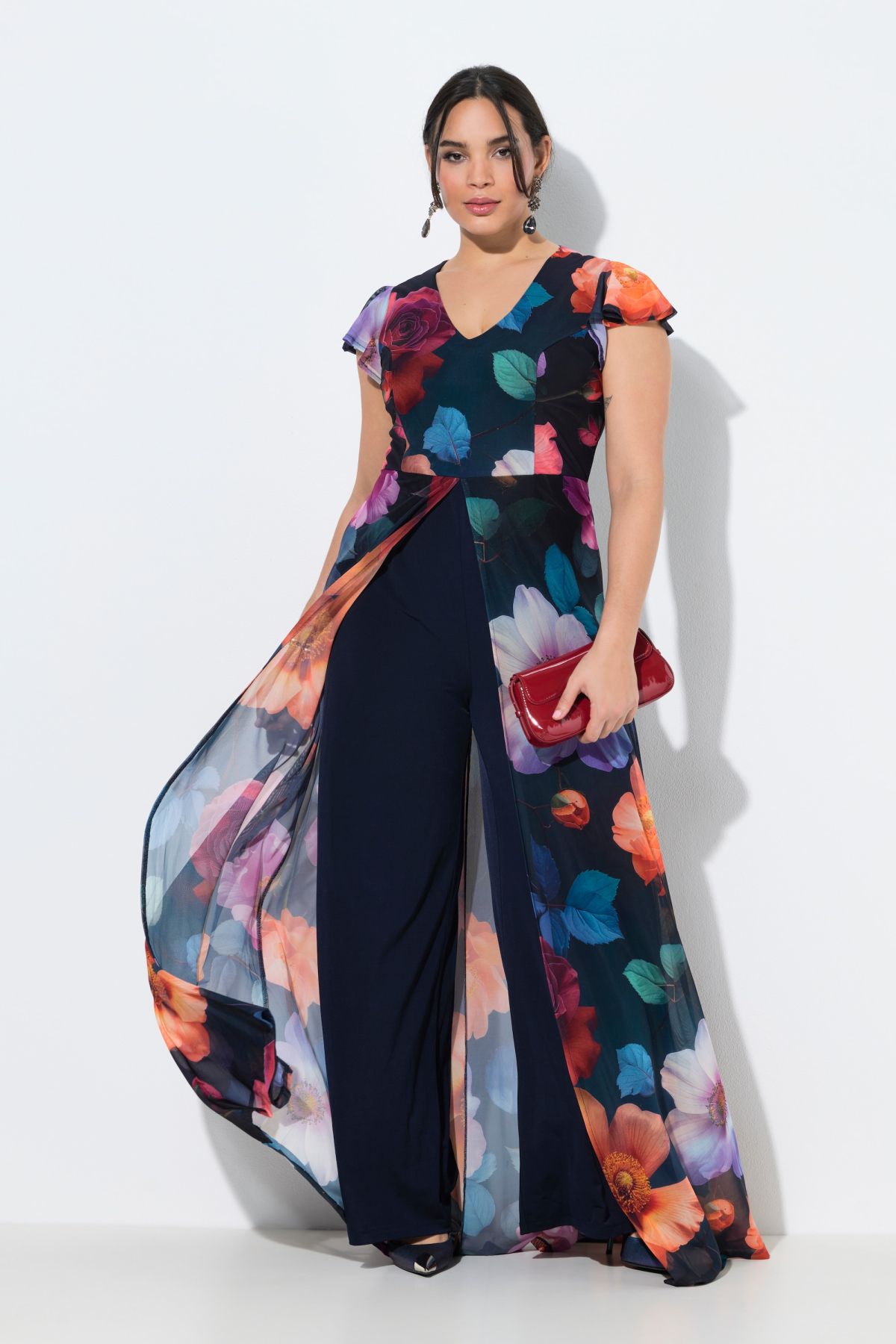 Гащеризон с двойна визия. С шифон с принт на цветя с V - образно деколте и къси ръкави тип шапка. С подплата от еластично трико с широки крачоли и без ръкави. С цип на гърба за лесно обличане.