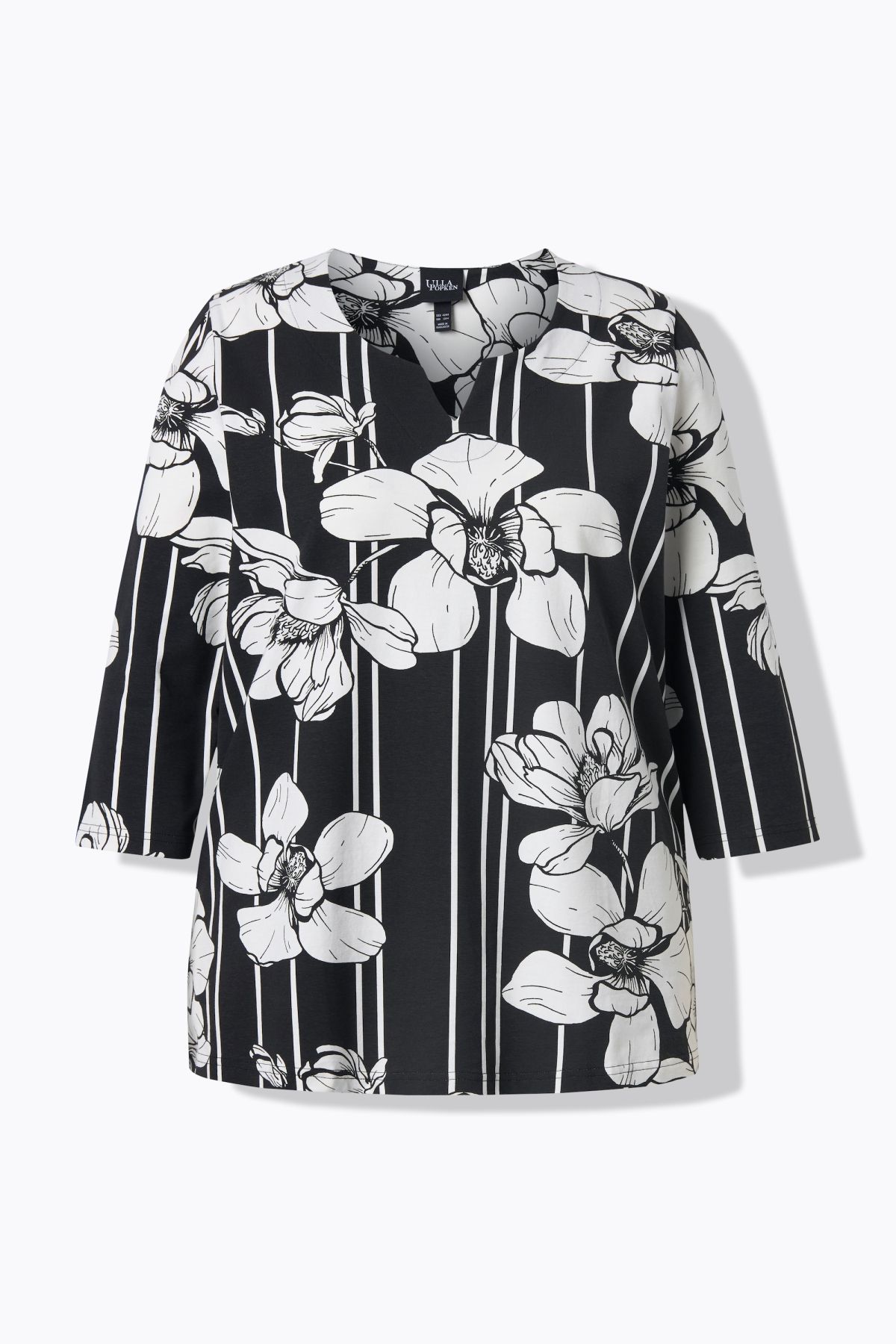 Тениска с принт на райета и цветя. От мека, памучна материя. С V - образно деколте и 3/4 ръкави. Стил и комфорт в ежедневието.