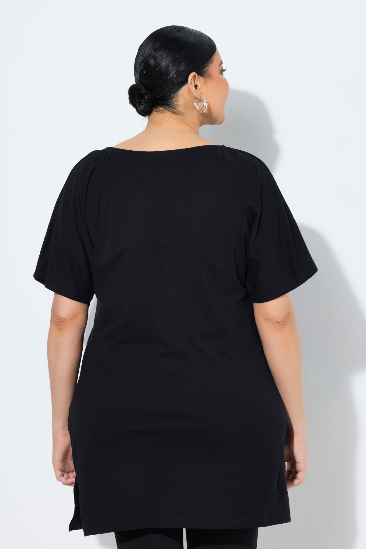 Дълга разкроена тениска тип туника. Едноцветна с кръгло деколте с цепка, паднали рамене, къси ръкави и странични цепки на подгъва. От мека, памучна материя.