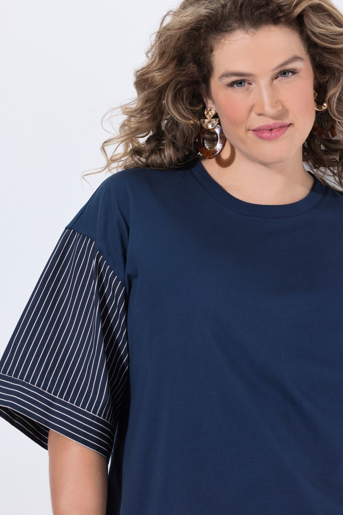 Тениска с раиран принт от мека модална материя. Със свободна кройка с кръгло деколте и паднали рамене. С прави 3/4 ръкави. От мека, памучна материя.