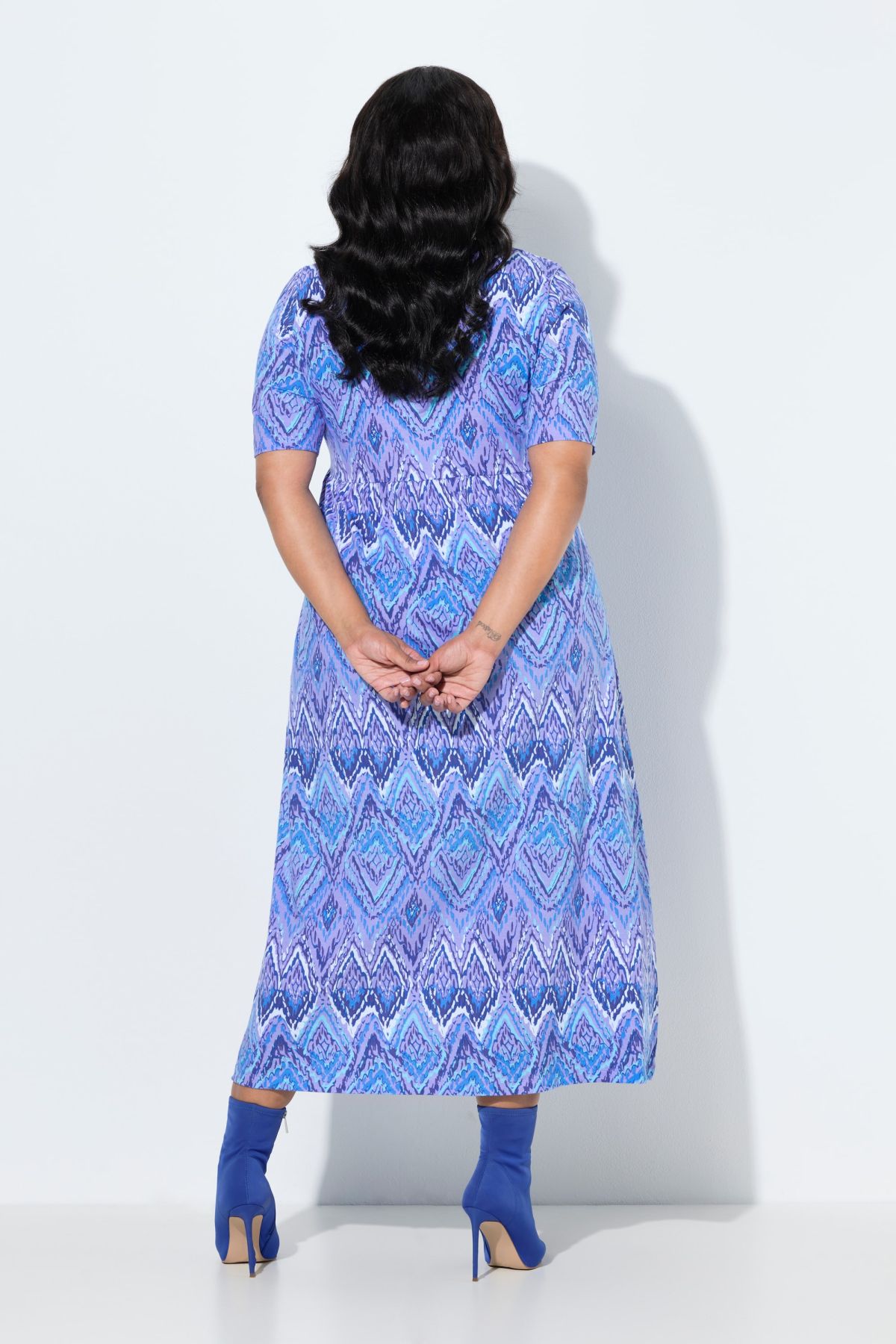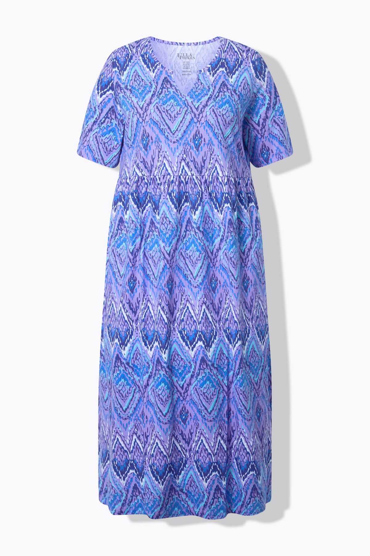 Рокля от трико с мраморен принт. С А - линия на силуета, деколте тип туника, еластична талия, къси ръкави и странични шевови джобове. Стил и комфорт в ежедневието.