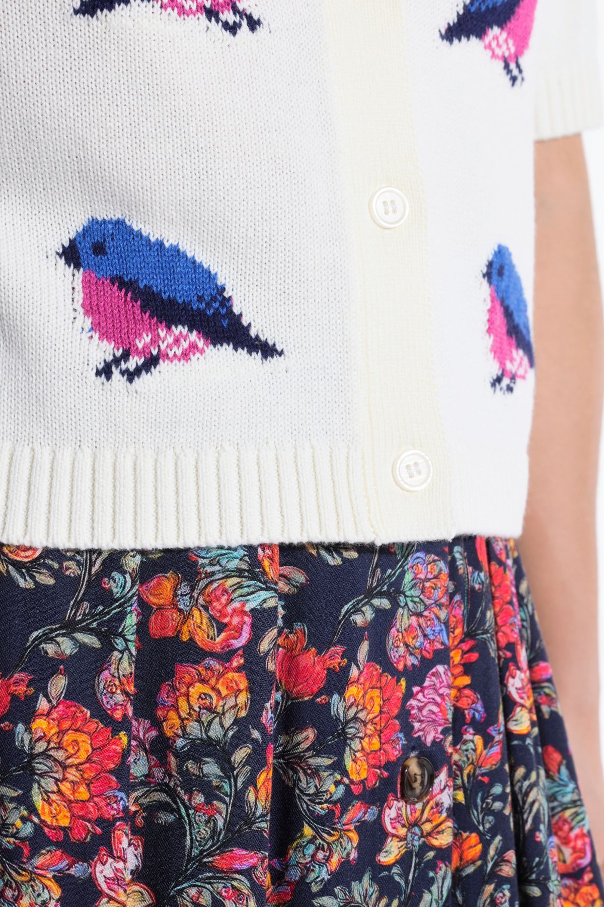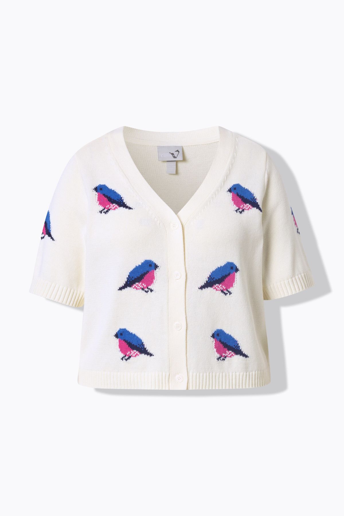 Жилетка с принт на птици с класическа кройка от мека, фина плетка. С V - образно деколте, копчета и къси ръкави. С рипсени маншети.
