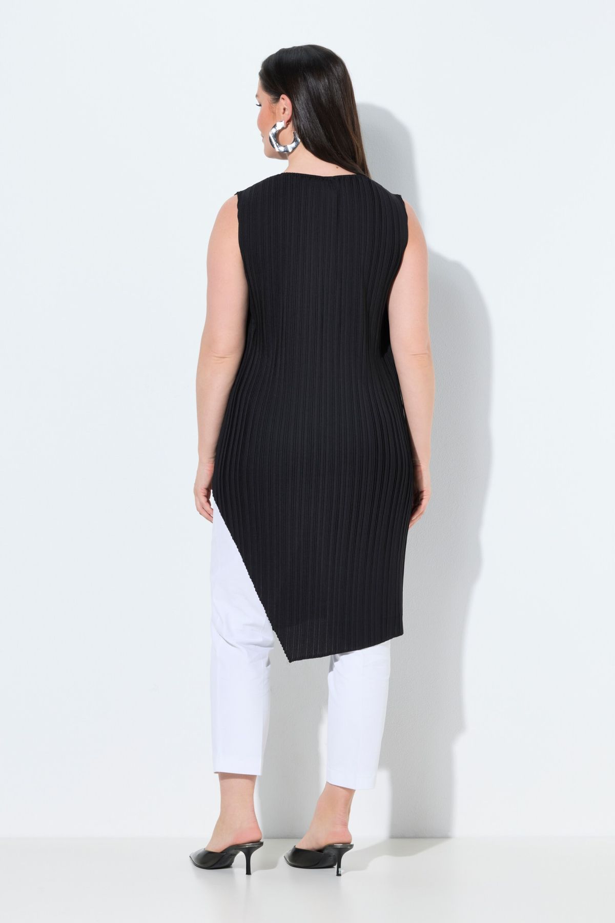 Туника с асиметричен подгъв и плисирана визия. Класическа кройка без ръкави, с дълбоки странични цепки и кръгло деколте.