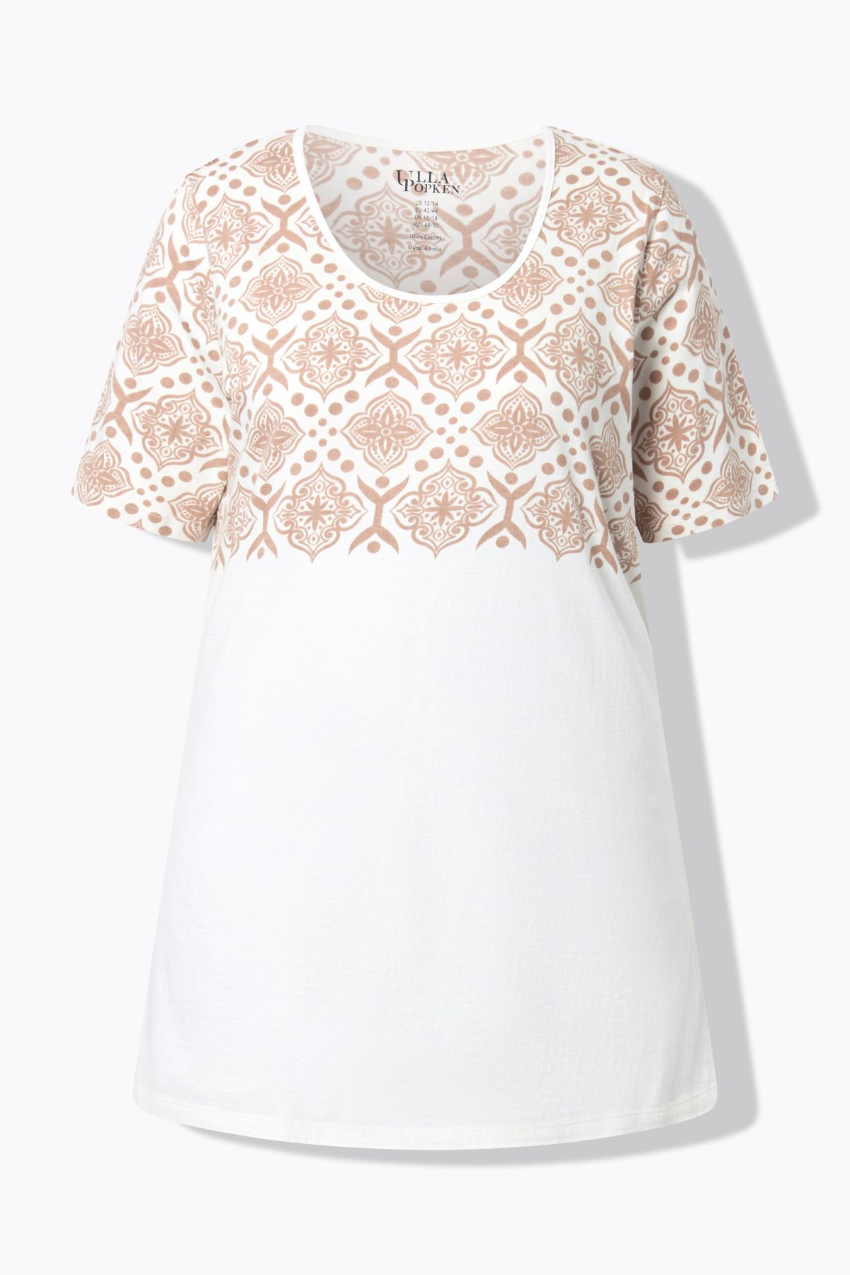 Туника с принт на цветя на деколтето. С А - линия на силуета, кръгло деколте и къси ръкави. Стил и комфорт в ежедневието.