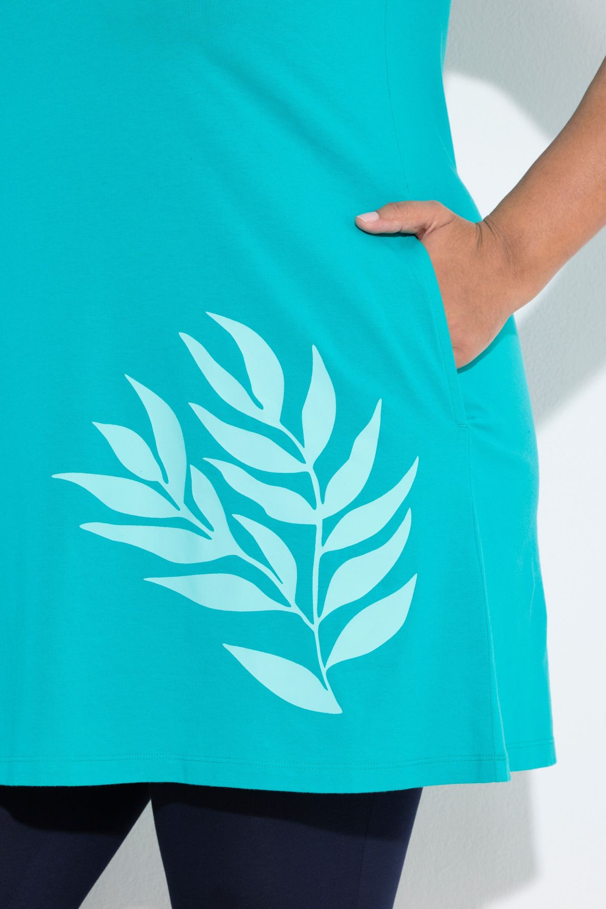 Туника с принт на листа с А - линия на силуета. С V - образно деколте и къси ръкави. От мека, памучна материя.