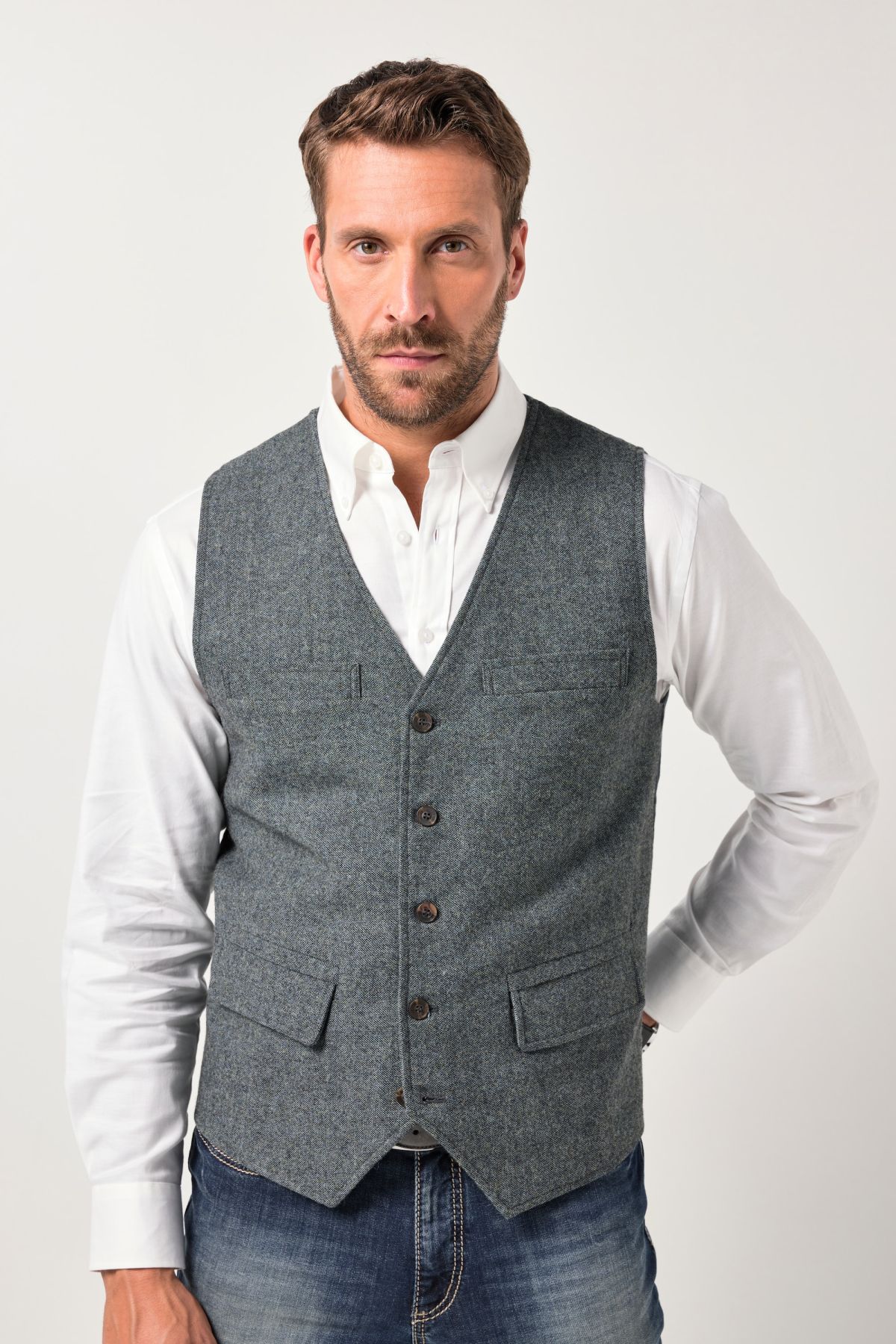 Официален елек перфектен за комбинация с множество костюми. С контрастни копчета отпред, V - образно деколте и странични джобове с капаци.