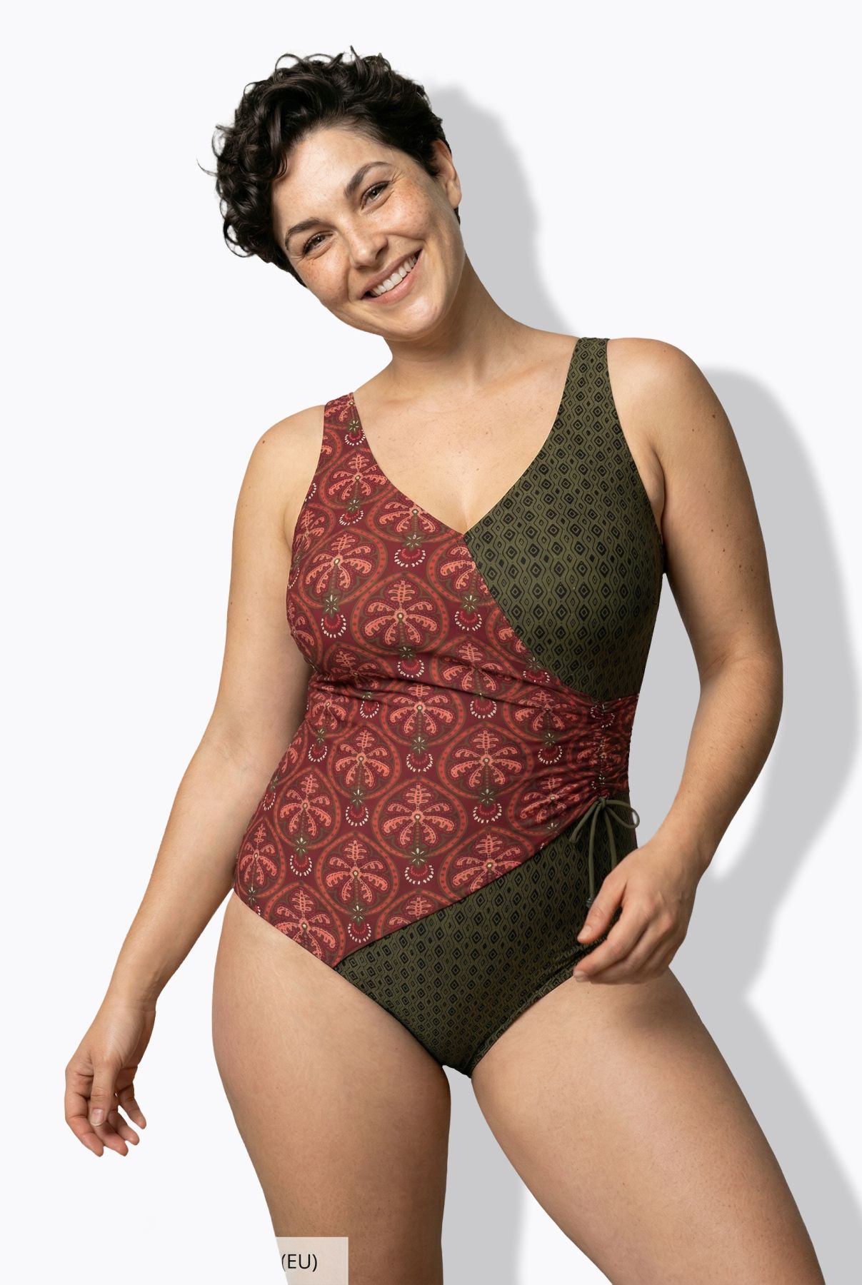 Бански с микс от принтове с визия тип прегърни ме. С декоративни кръгови акценти отстрани и микс от мотиви. С V - образно деколте, оформени чашки, еластична лента под бюста за поддържане и широки презрамки С подлата отпред